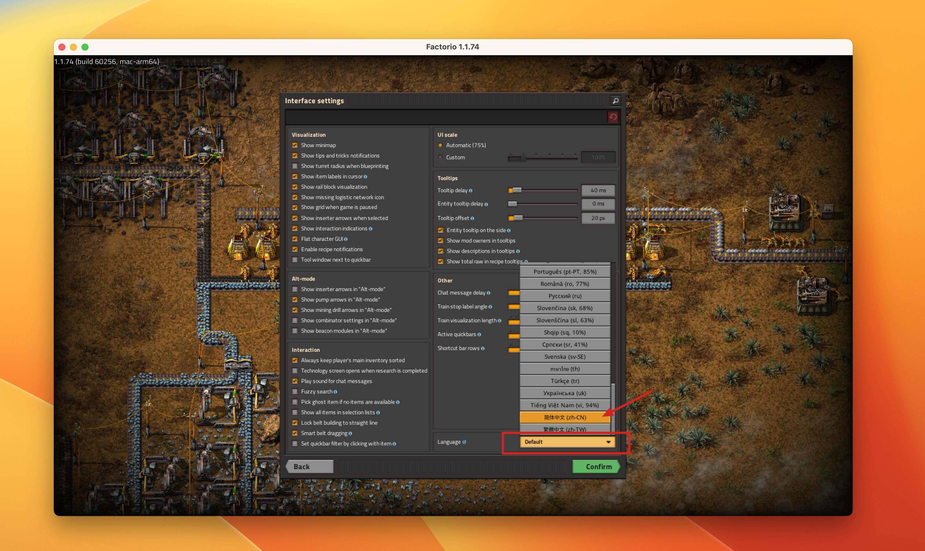 4.找到语言选择,点击右侧的箭头,选择【chinese】中文,点击【confirm】确认,重启游戏即可 如下图