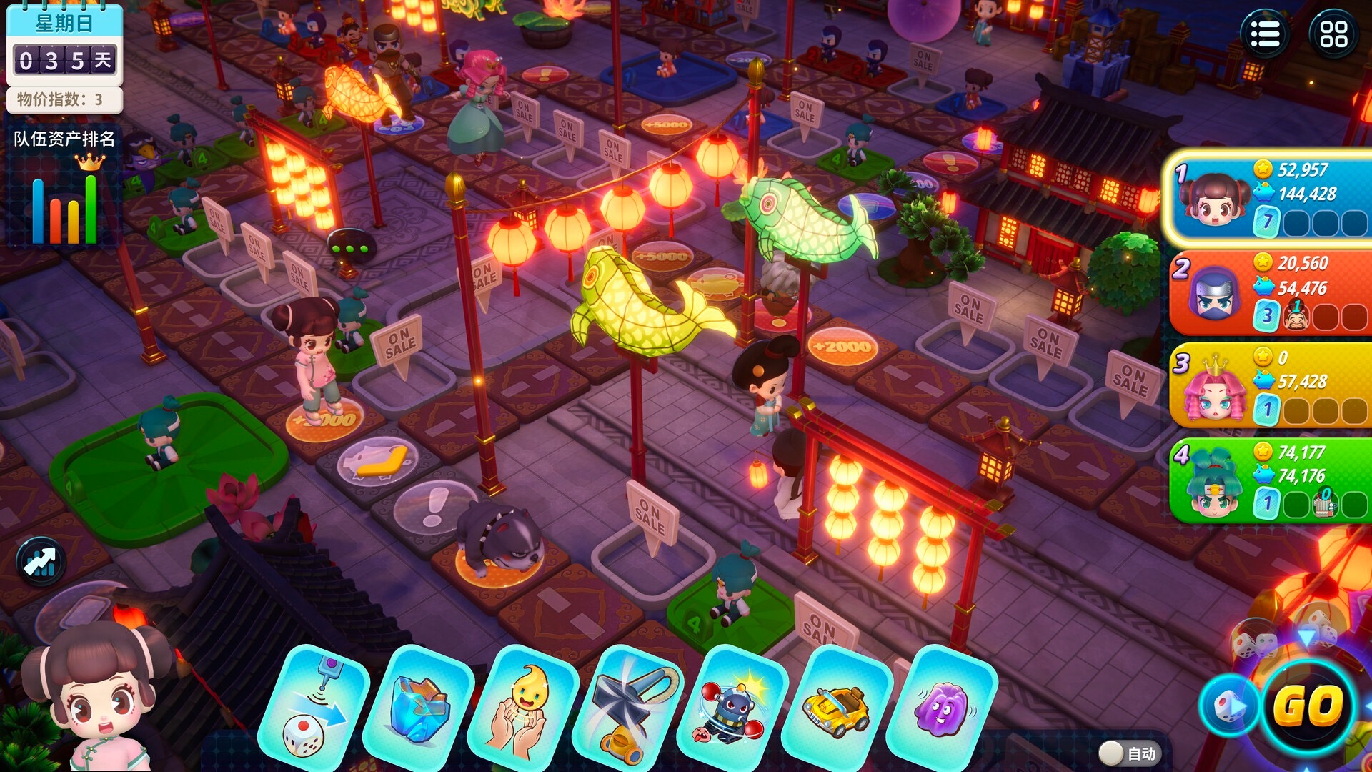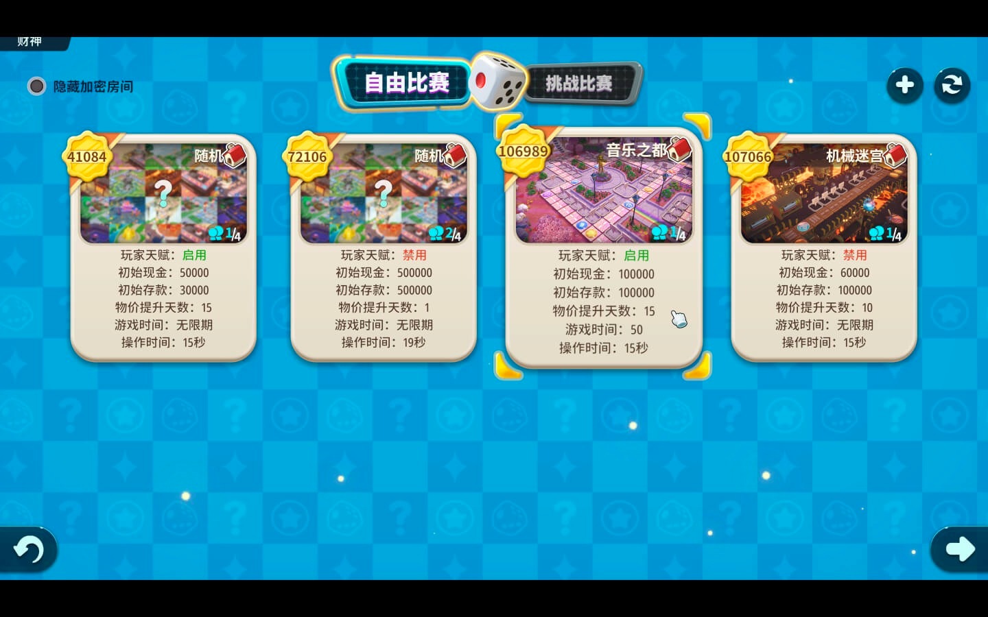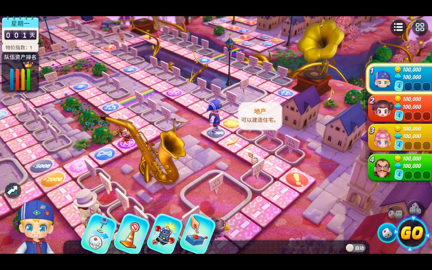 《大富翁11》可供本地游玩和在线游玩,支持多控制器。你可以根据自己的喜好创建自由比赛或者挑战比赛,并自定义比赛参数。在比赛中,你需要投掷骰子来决定自己的前进步数,通过投资地产、买卖股票、使用卡片等方式赚取金钱。比赛结束时,唯一未破产或资产最多的队伍为获胜方