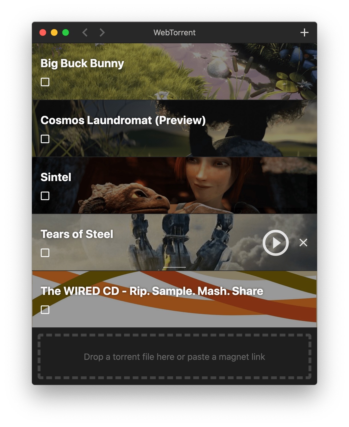 搜集到的WebTorrent for mac 是一款通过Bt就能在线播放视频的软件,通过拖入BT种子文件或复制magnet磁力链接就可以播放视频。