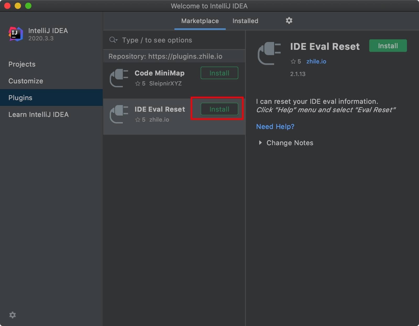 2、在弹出窗口中点击+号添加仓库地址,添加完成后,可在列表中找到IDE Eval Reset 插件,点击 Install 进行安装。