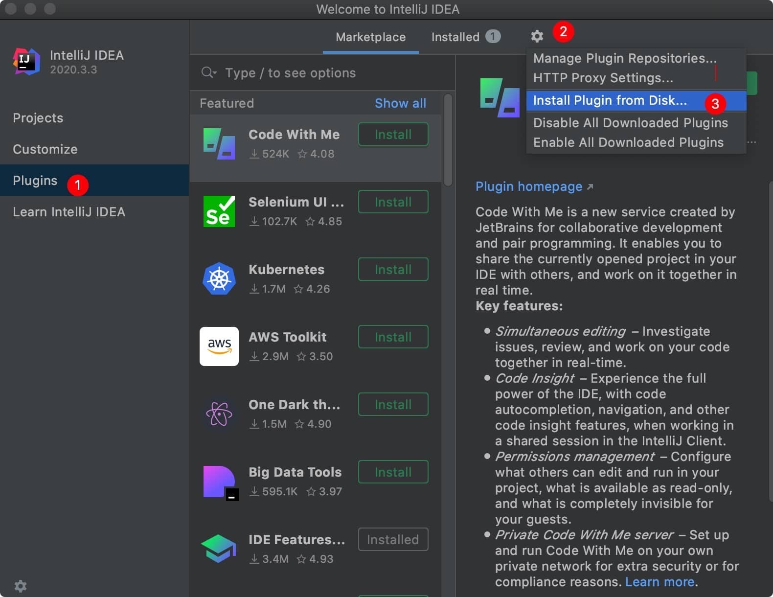 2、进入软件后,在左侧菜单,点击 Plugins,然后点击右上方的齿轮图标,选择下拉菜单选择“Install Plugin form Disk”,进行手动添加插件,如下图