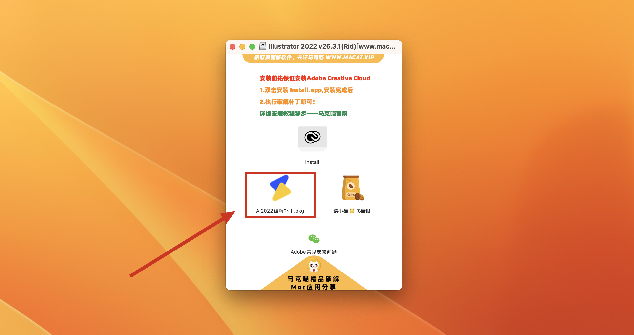 安装完成后返回镜像包,双击Ai2022X破解补丁.pkg,根据安装器提示完成安装即可破解。