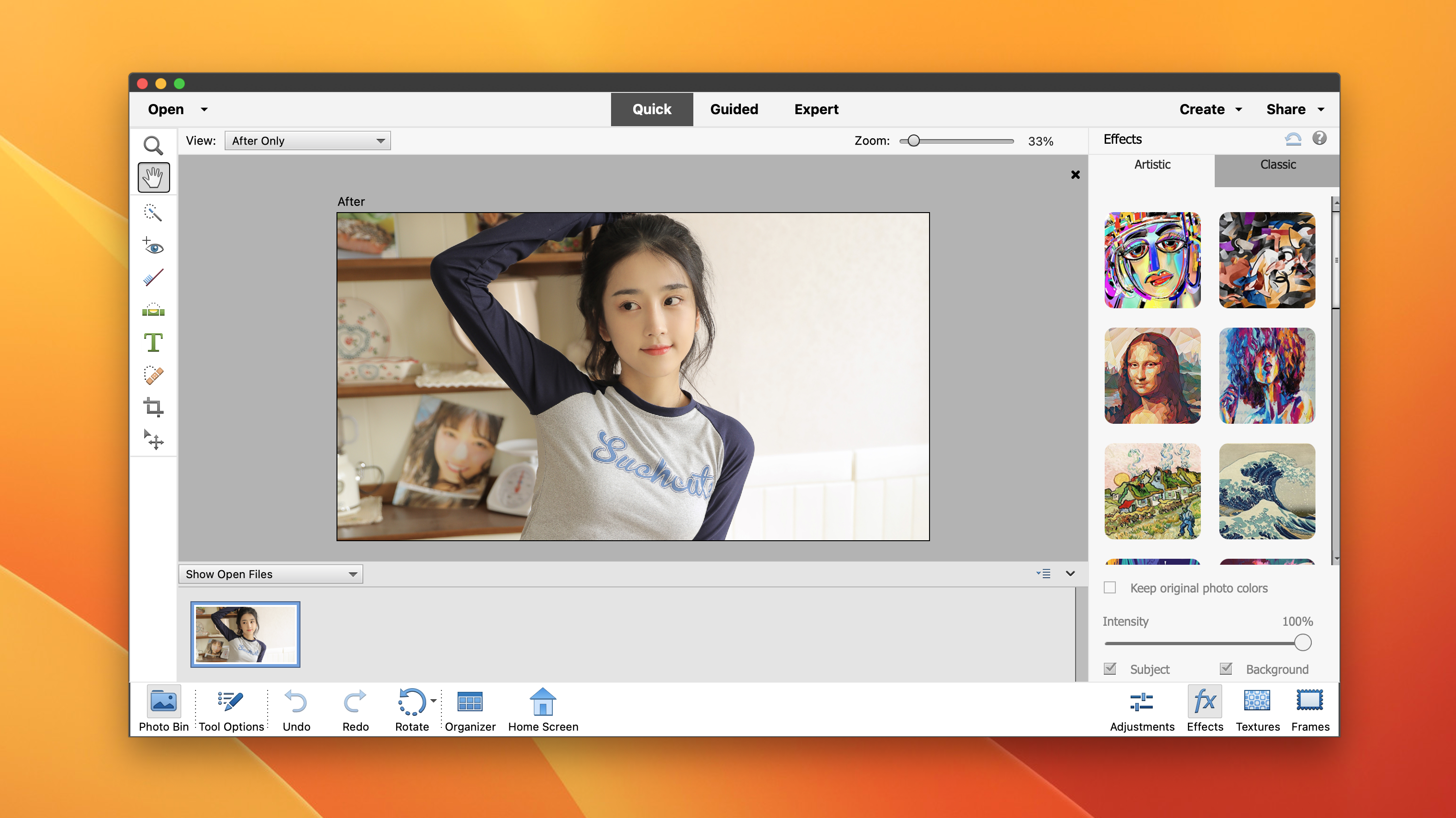 Photoshop Elements 2023(ps简化版2023)Adobe公司智能图像处理软件。虽然叫简化版,但是体积却比ps正式版还要大,是Adobe公司是继Photoshop之后全新推出的图像编辑、照片修饰和 Web 图形解决方案。它界面友好(更简陋),易于使用,功能强大。