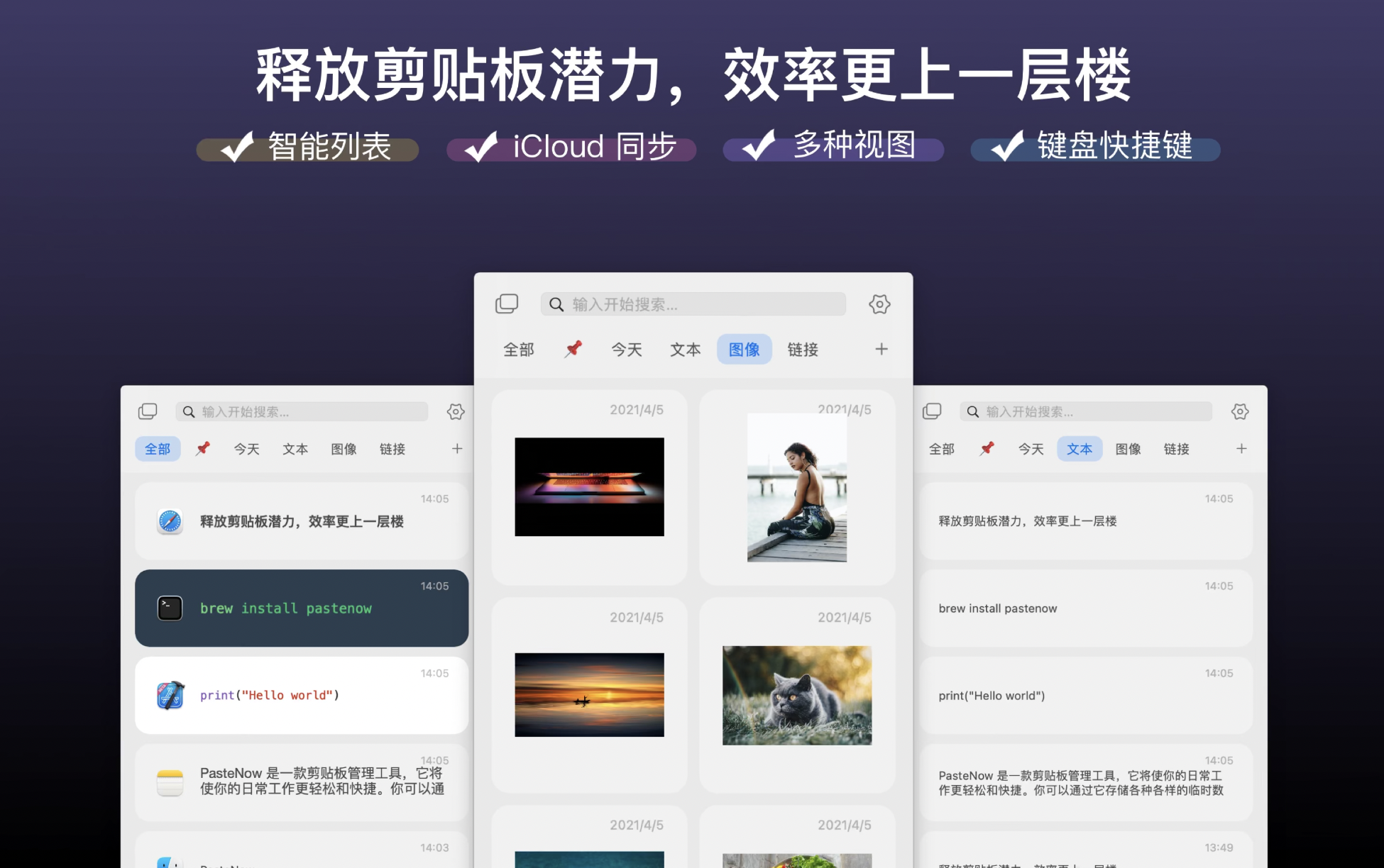 PasteNow 是一款应用于Mac平台的剪贴板管理工具,它将使你的日常工作更轻松和快捷。它可以存储多种格式的复制历史数据:文本、链接、图像等等。