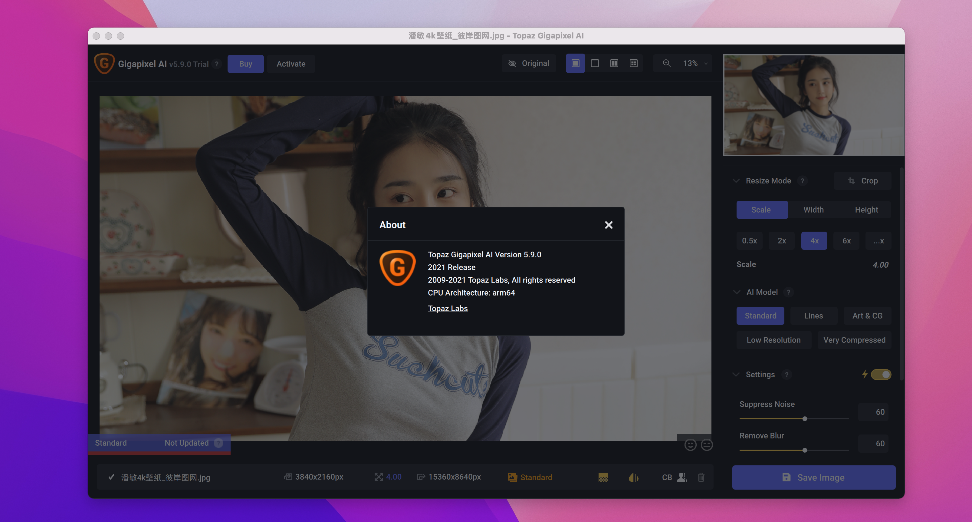 Topaz Gigapixel AI 是一款通过人工智能AI计算无损放大图像软件,topaz gigapixel ai破解版采用人工智能图像扩展技术,在你放大的同时不会对图像的细节造成损坏,轻松将它放大到你需要的尺寸,GPU处理速度提高了5倍。