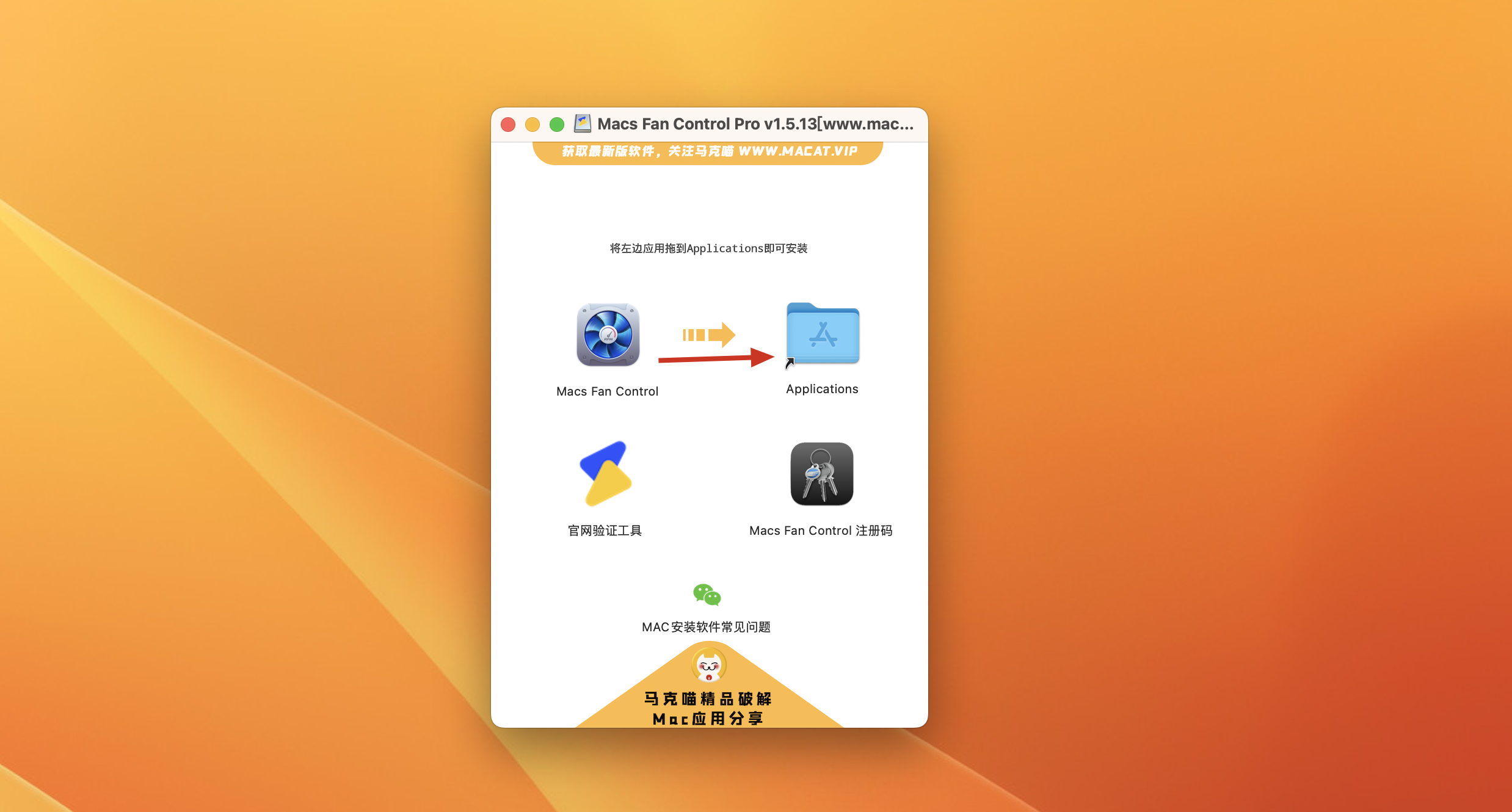 1.镜像包下载完成后打开,将左侧的Macs Fan Control拉到右侧应用程序中。