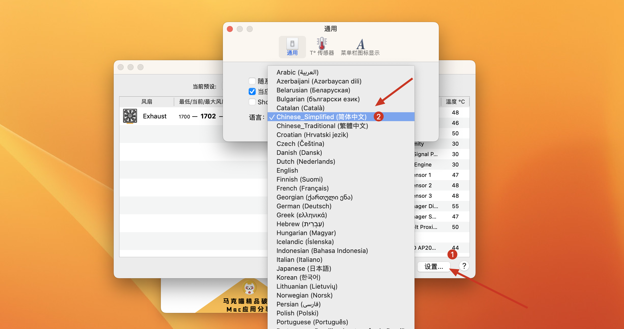 2.然后打开软件,点击菜单栏的Macs Fan Control,然后点击preferences,选择chinese_simplified