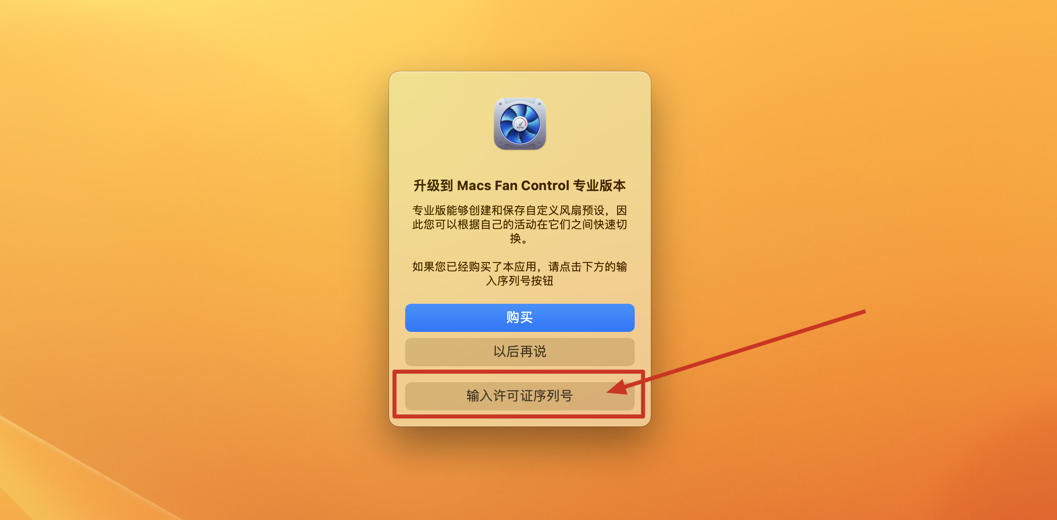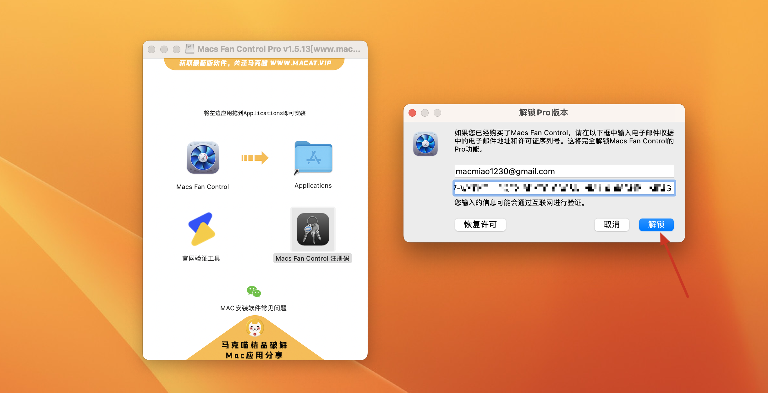 7.将Macs Fan Control注册码复制粘贴到Macs Fan Control注册界面,然后点击解锁