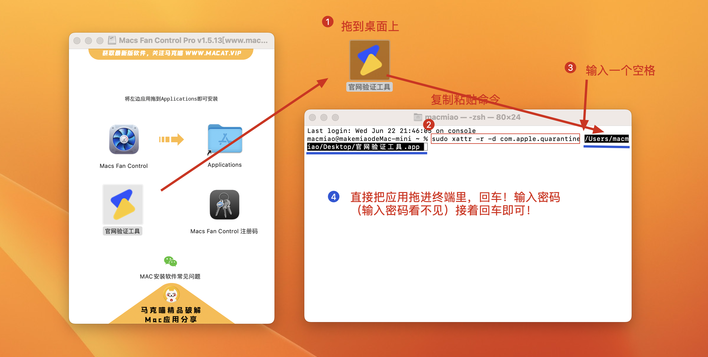 sudo xattr -r -d com.apple.quarantine /Users/你的电脑名/Desktop/官网验证工具.app
