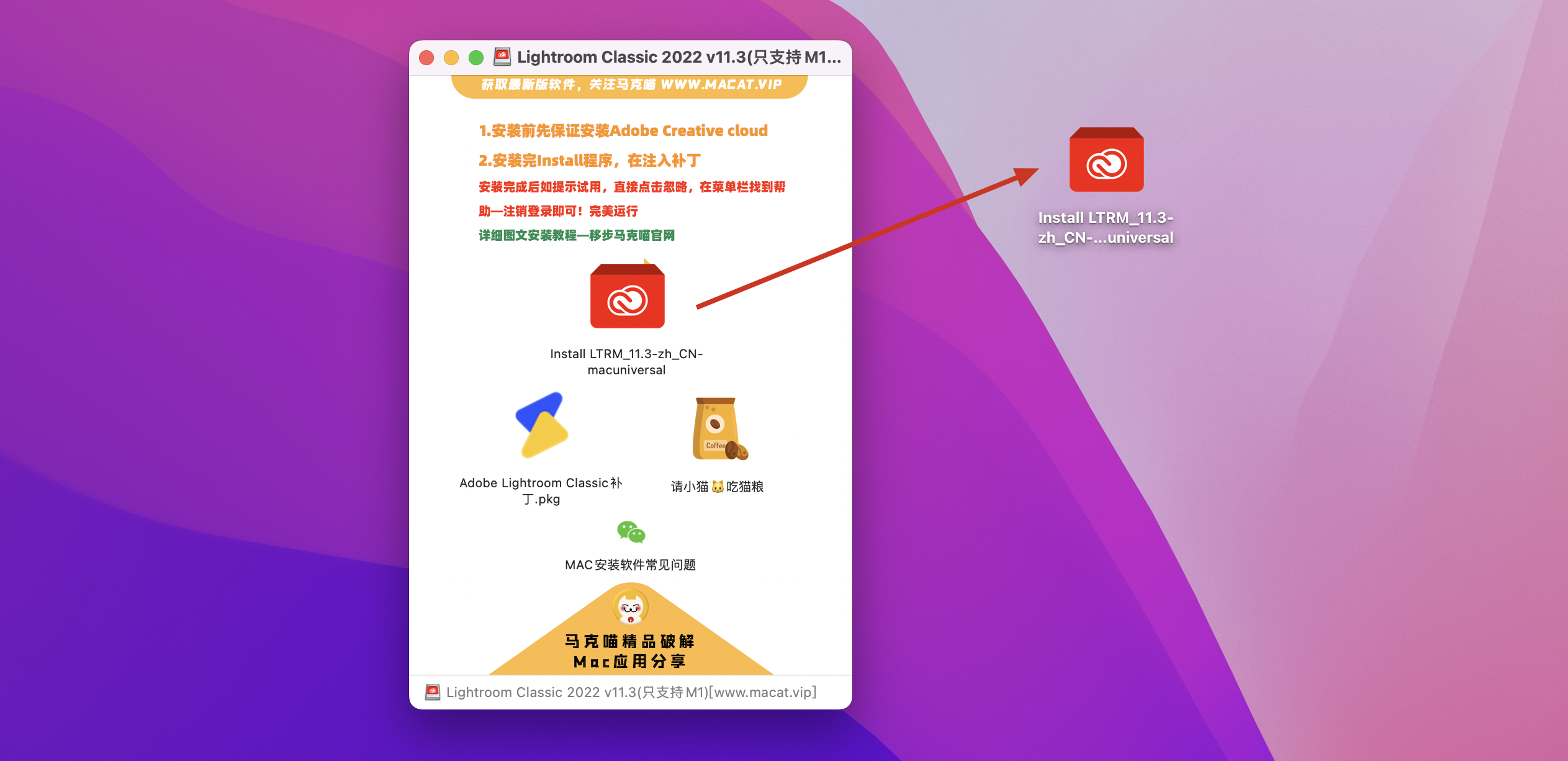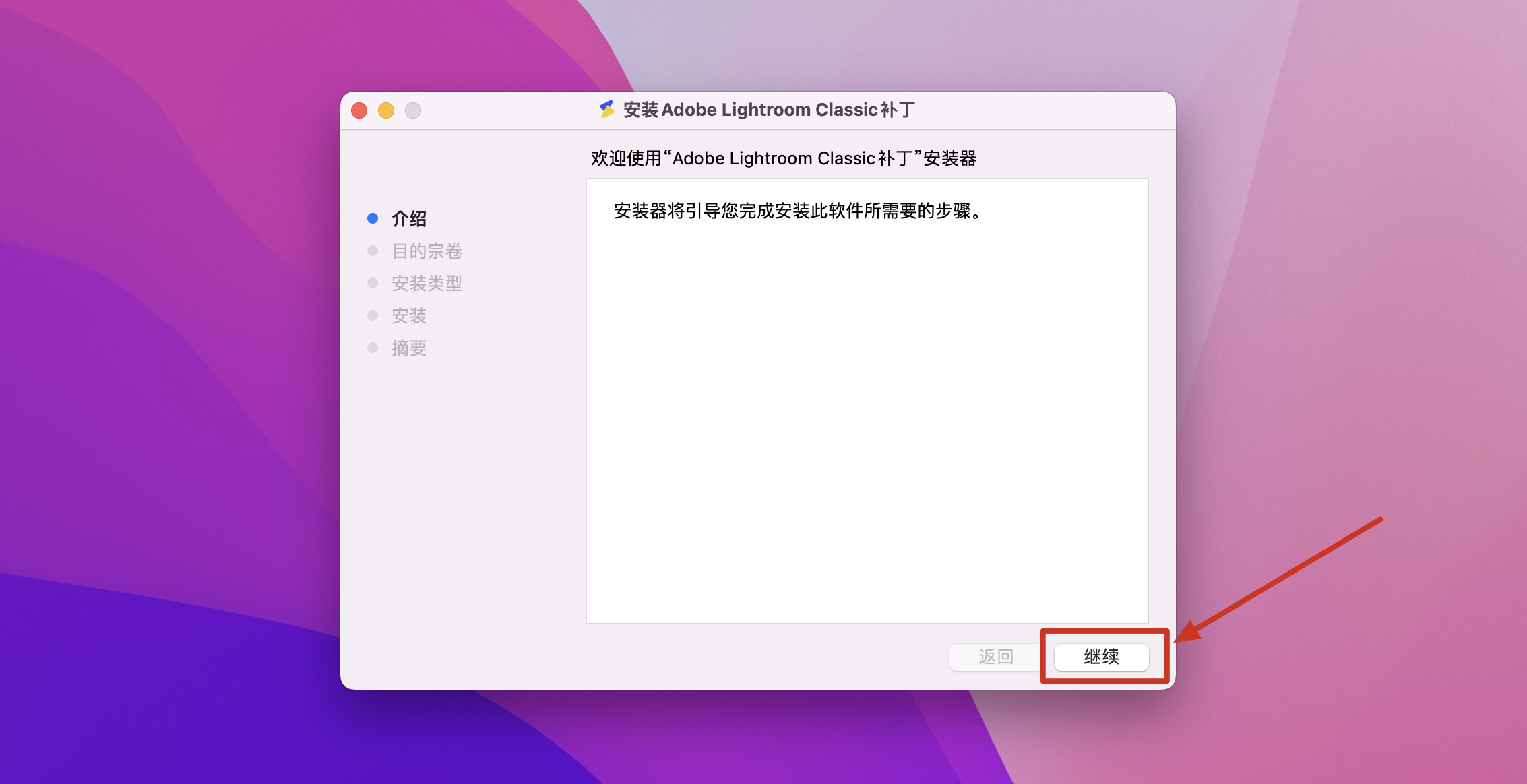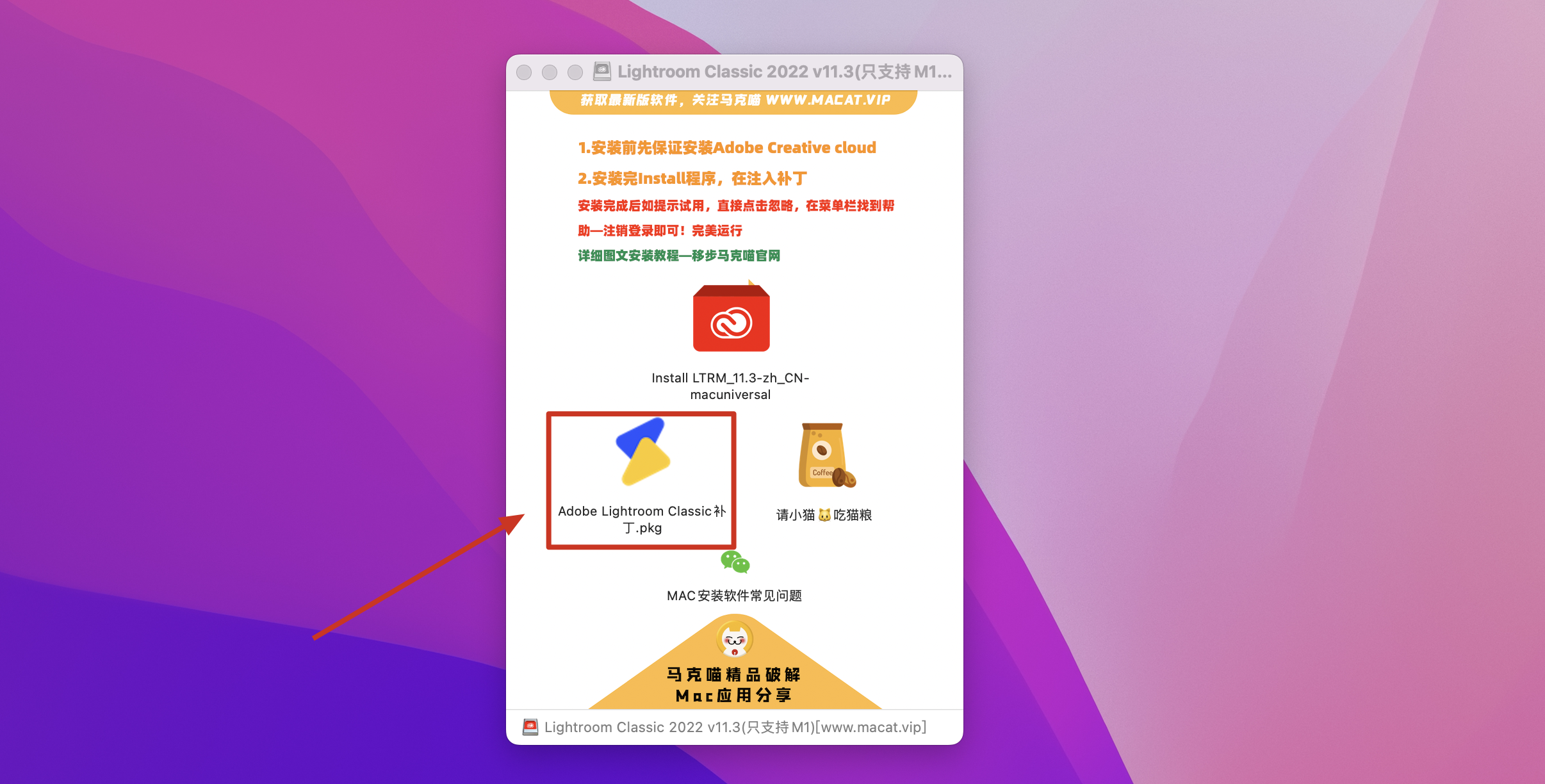 安装完成后返回镜像包,双击Lightroom Classic破解补丁.pkg,根据安装器提示完成安装即可破解。