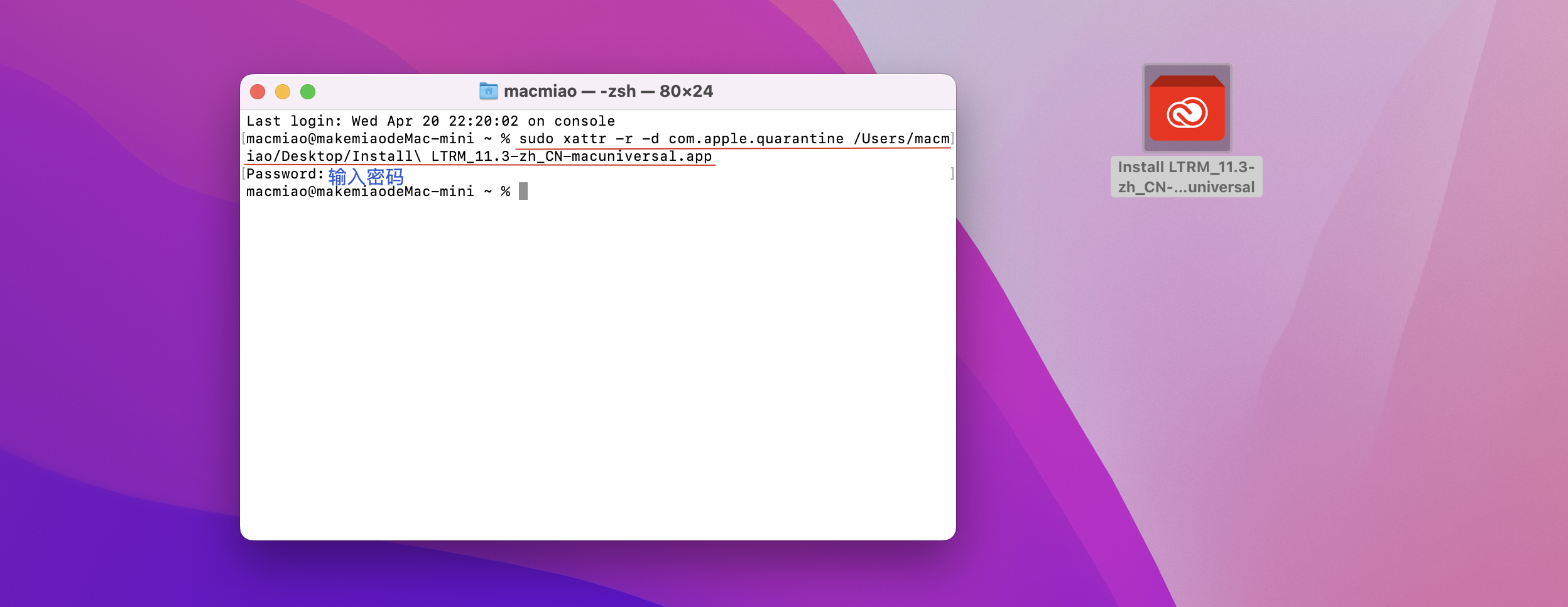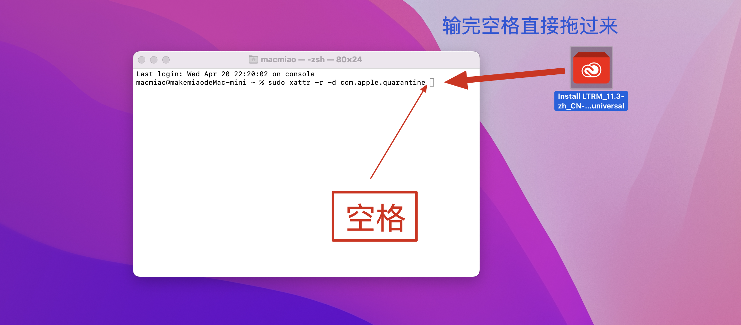 打开终端输入sudo xattr -r -d com.apple.quarantine,加空格,把install安装器拖到终端,按回车。