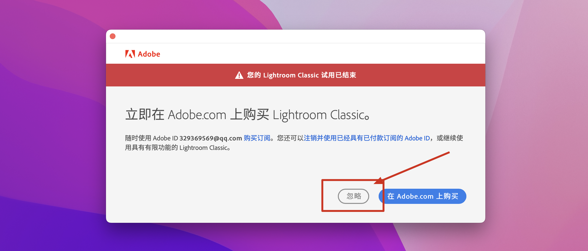 4.安装完成后打开Lr软件,如果您登录账号的话会提示试用,直接点击忽略,如图: