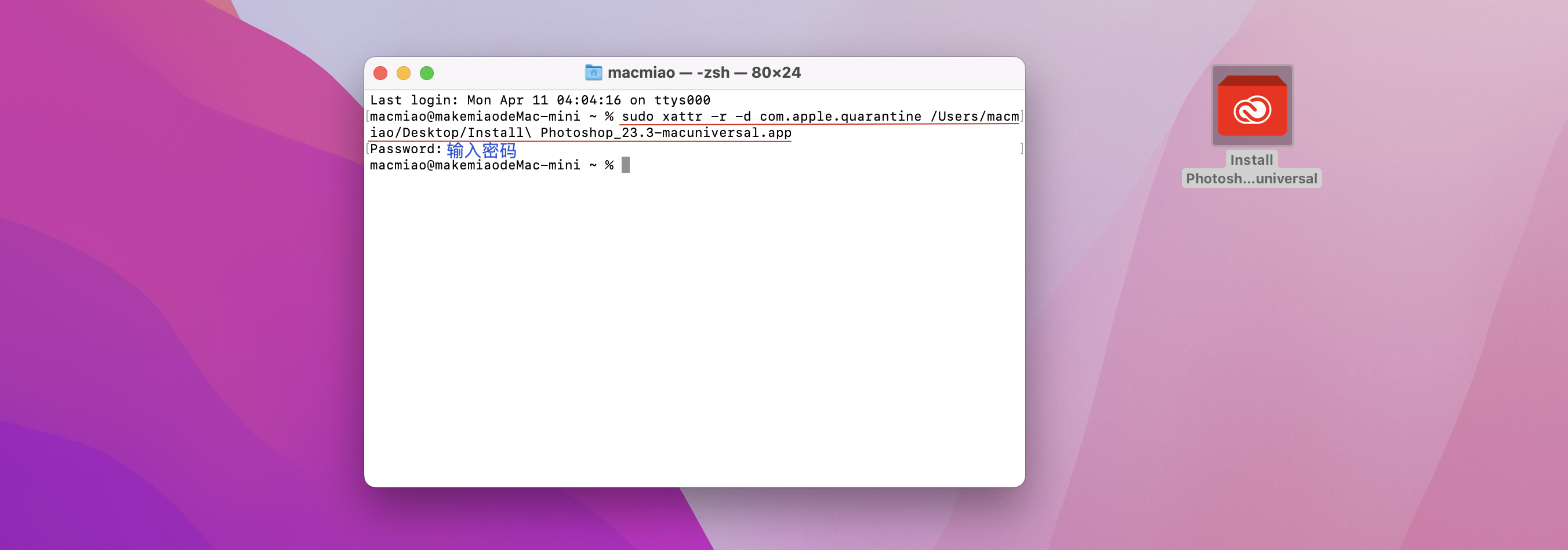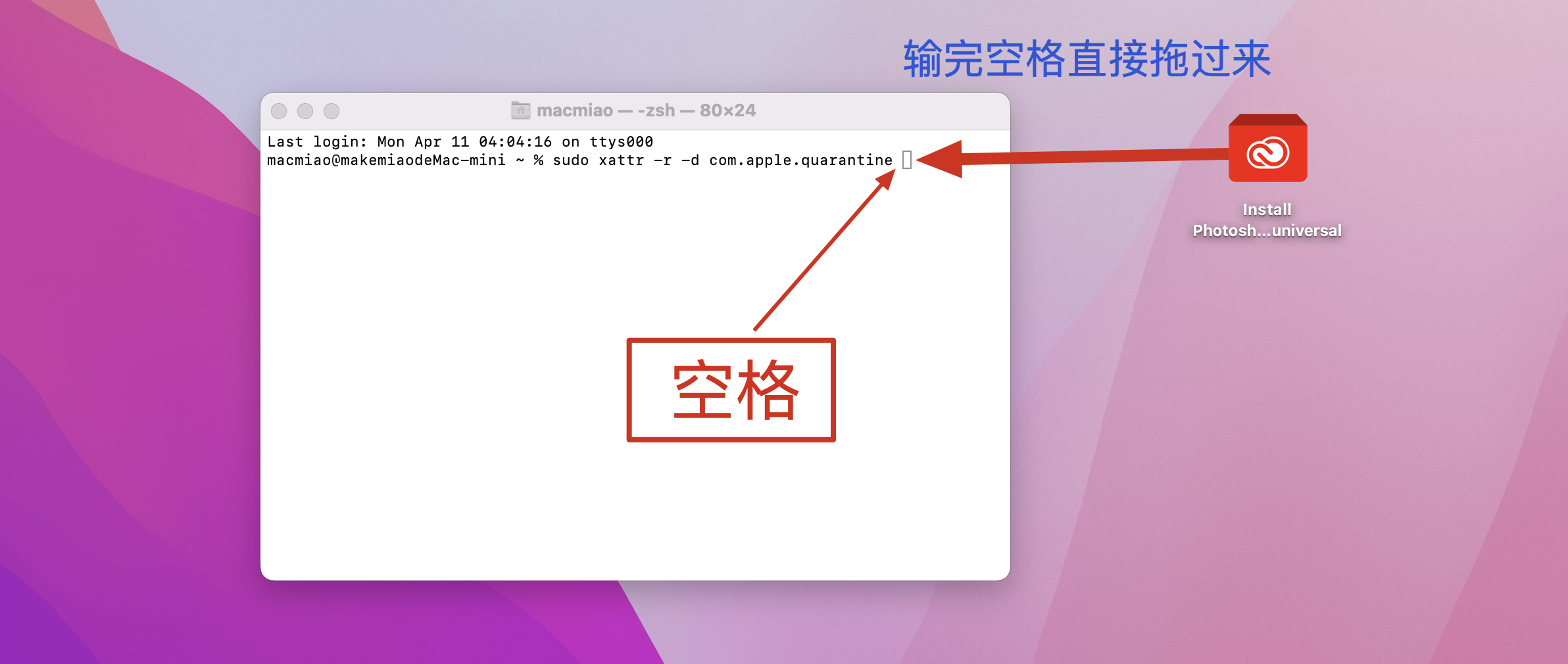 打开终端输入sudo xattr -r -d com.apple.quarantine,加空格,把install安装器拖到终端,按回车。