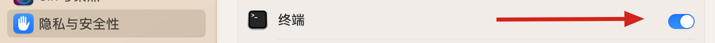 打开 “完全磁盘访问” 权限.系统偏好设置 ▸ 隐私与安全性 ▸ 完整磁盘访问权限 ☑️勾选了终端 (如果之前勾选过-然后+)
