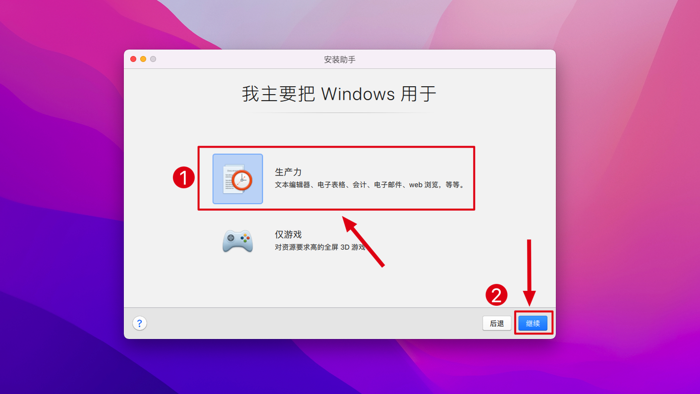 6.选择【生产力】,点击【继续】