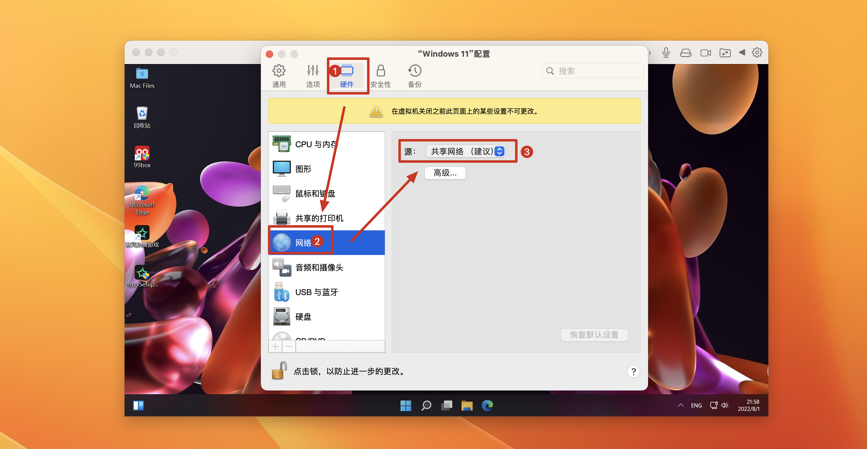 12.在硬件—网络里,在源处选择共享网络(建议)