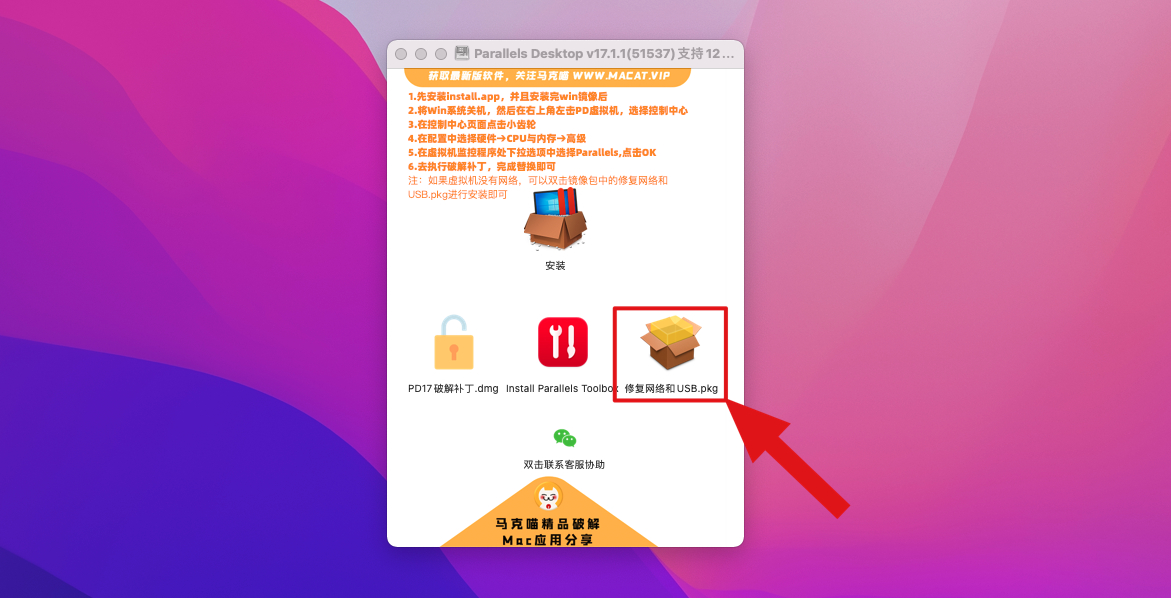 如果虚拟机没有网络,可以双击镜像包中的修复网络和USB.pkg进行安装即可