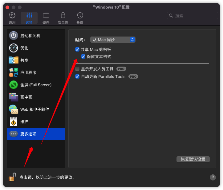 打开镜像设置-点击左下角【解锁】–点【更多选项】-勾选☑️共享Mac剪贴板