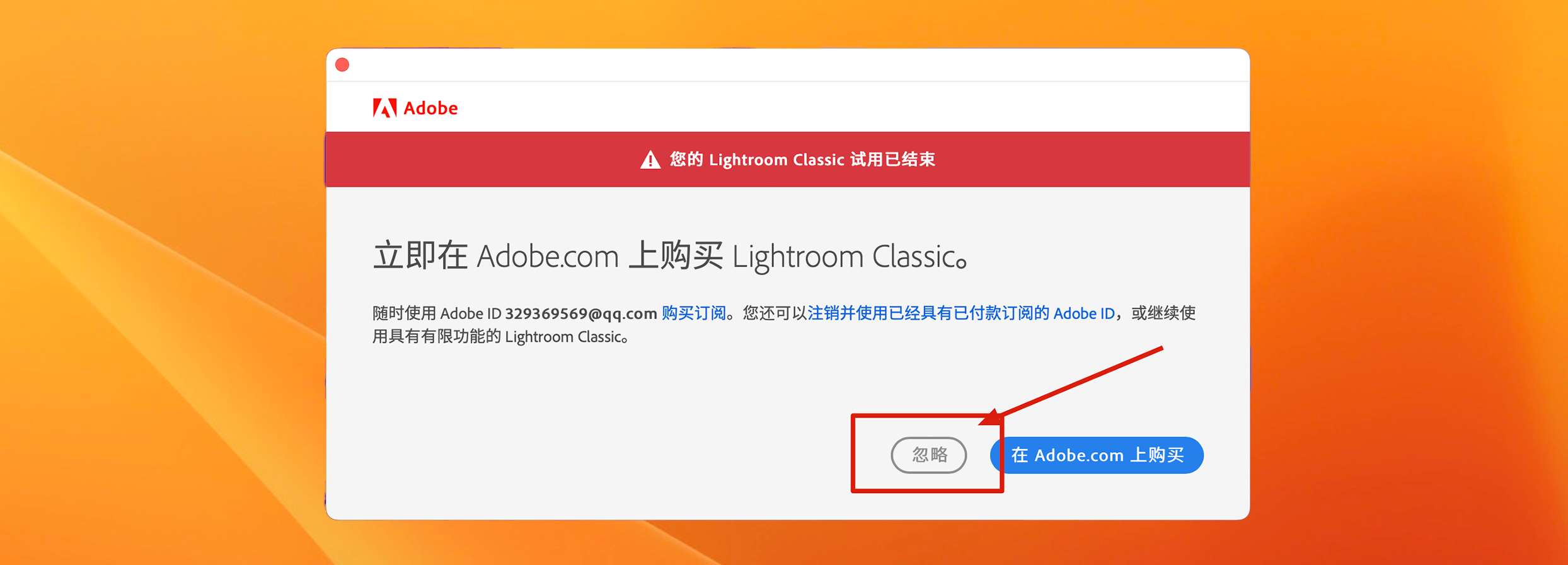 安装完成后,运行Lightroom Classic,选择试用,并在试用提示中选择“忽略”