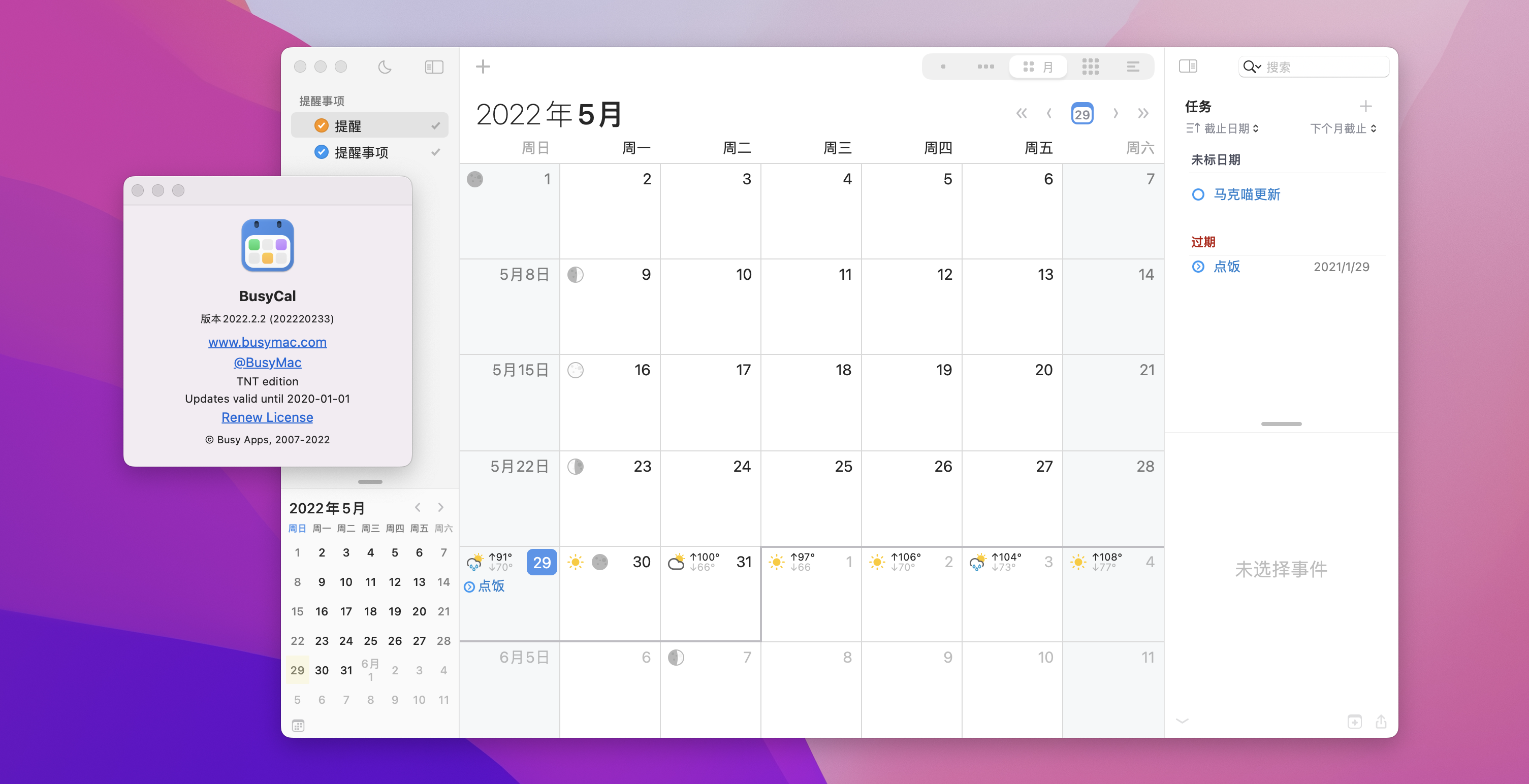 BusyCal for mac是Macos上一款功能非常强大的任务日历软件,支持iCloud, Exchange, Google Calendar, CalDAV等日志服务,拥有非常好用的同步功能,且日历中集成天气预报等等细节都非常的不错。