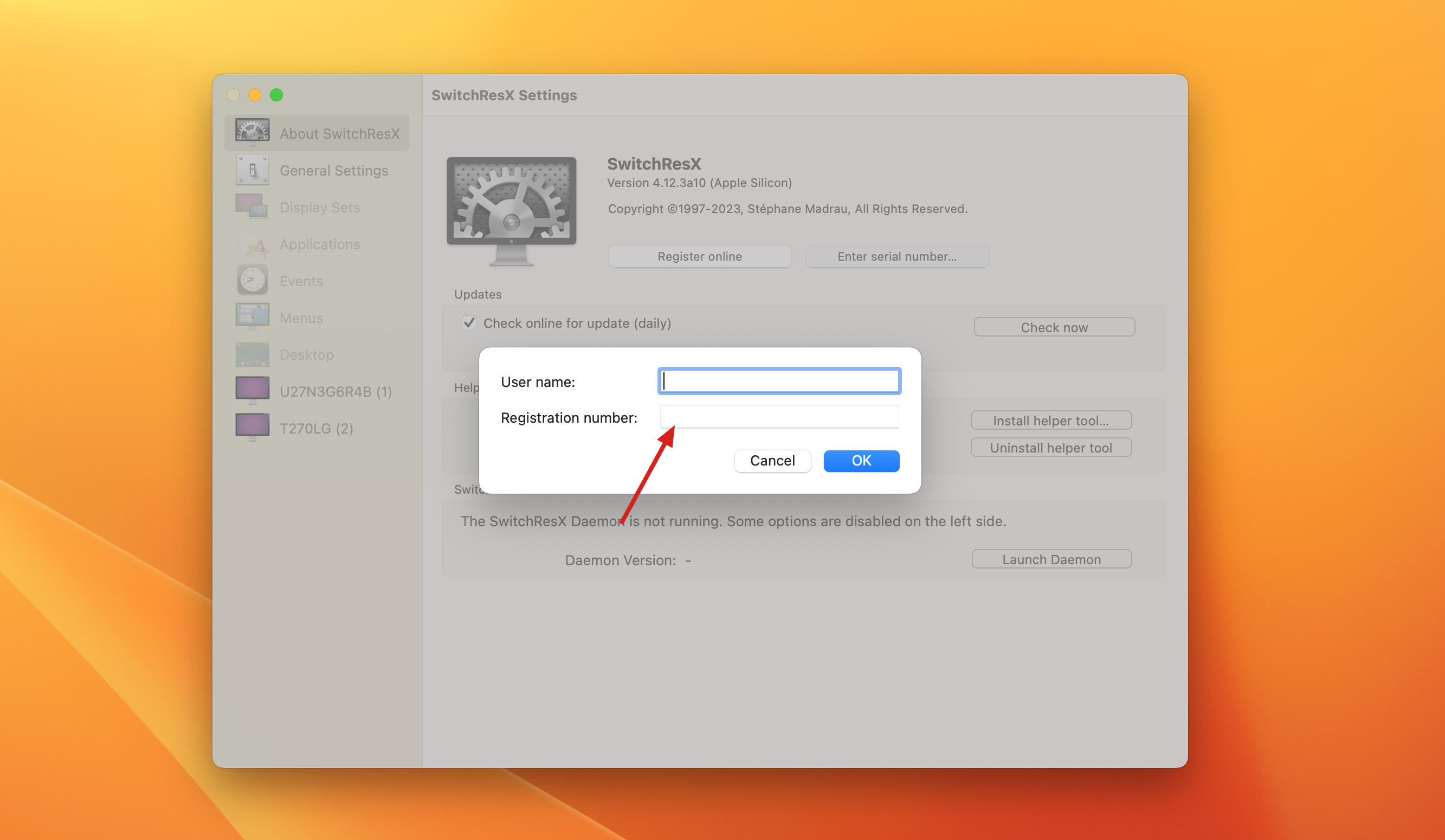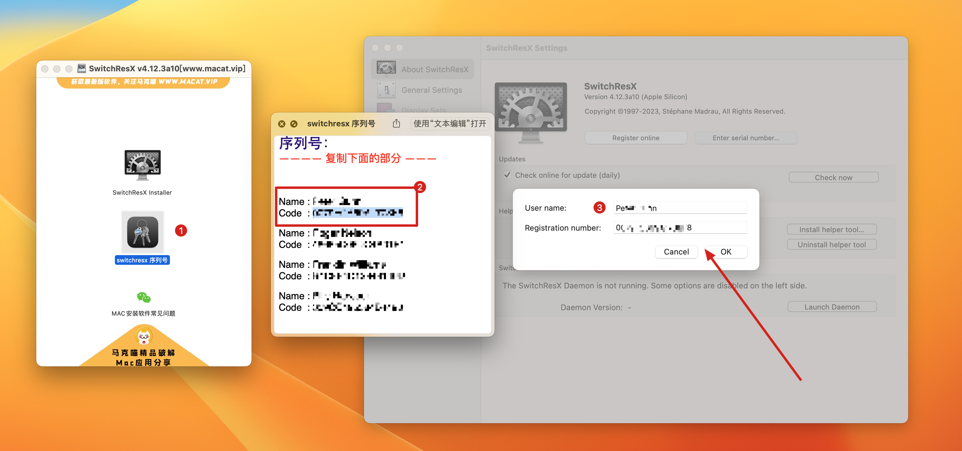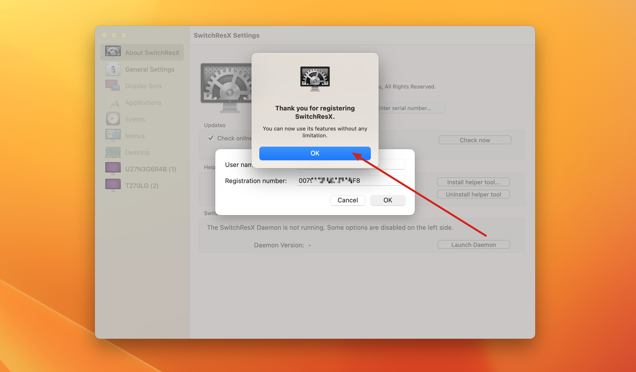 5.回到switchresx for Mac激活版安装包,双击打开switchresx 序列号,将switchresx 注册码复制到注册页面,然后点击OK,如下图所示: