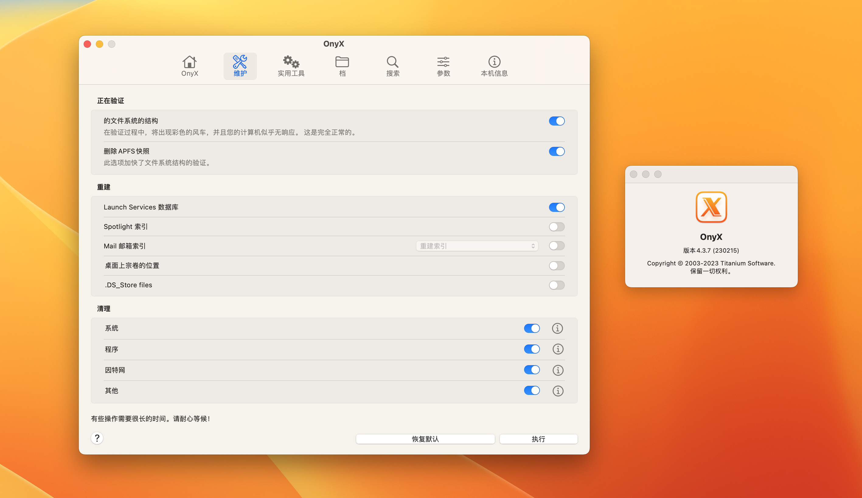 Onyx for mac 是一款mac系统清理及优化工具。可以增强系统性能,整理垃圾文件,以及对系统进行美化,比如分享Mac下的动态桌面等动能。属于Mac常用软件,但系统整理推荐一月一次出名的大神器。