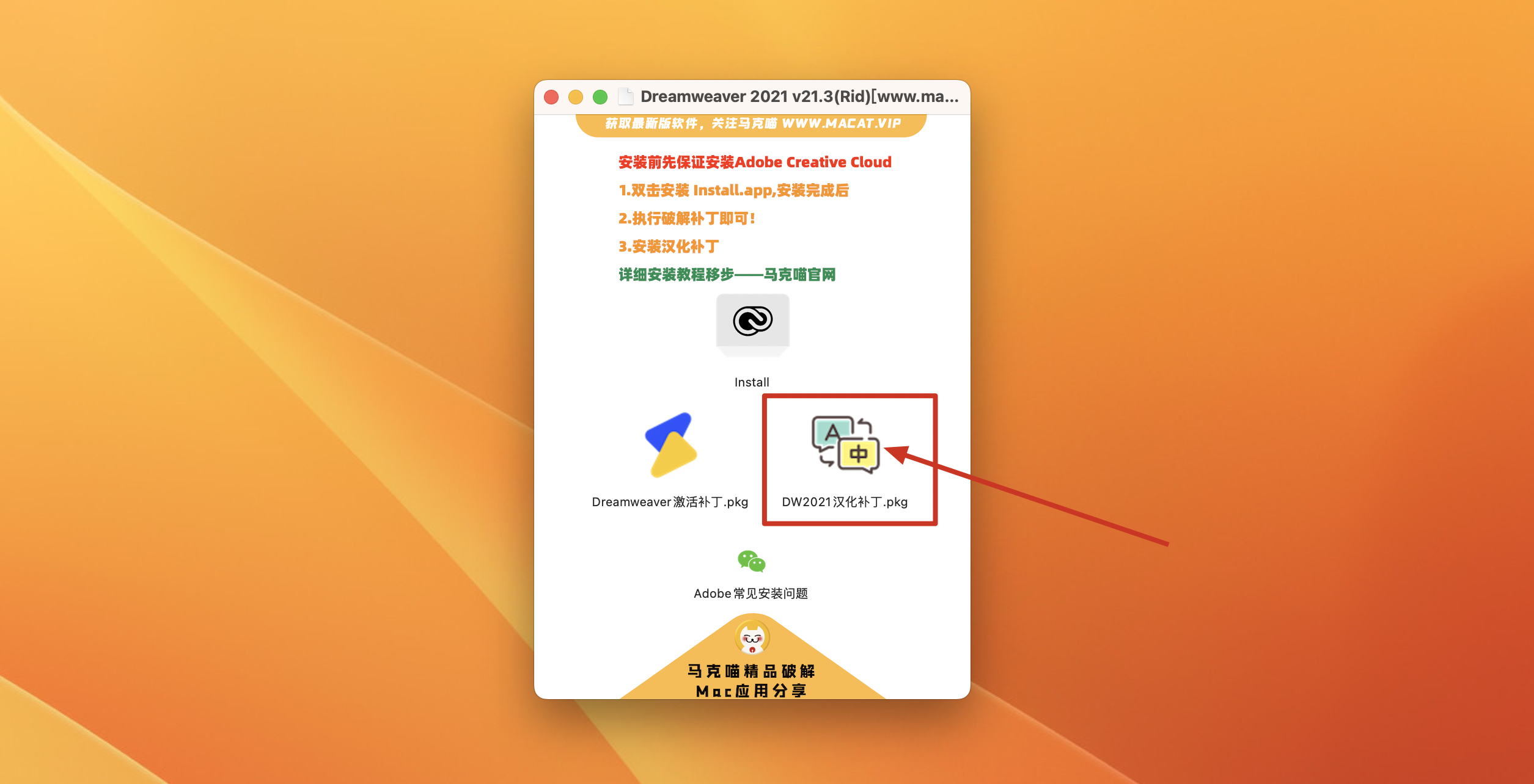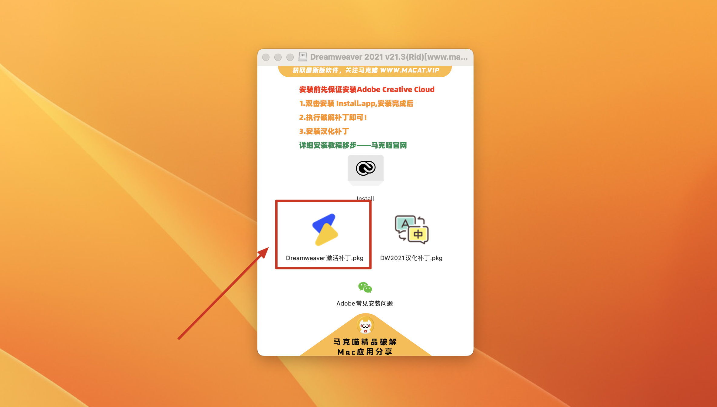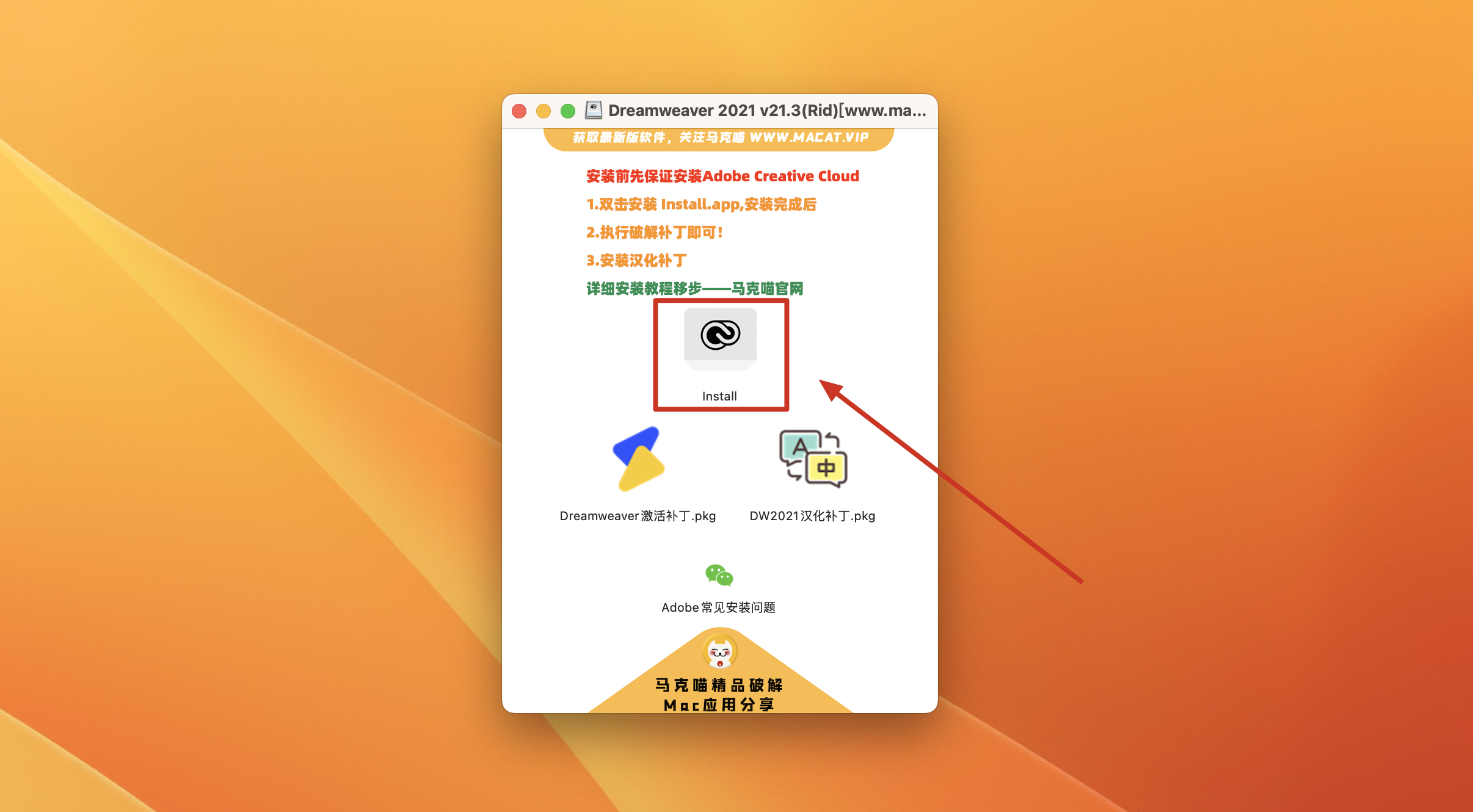 Dreamweaver下载完成后打开,直接双击install安装