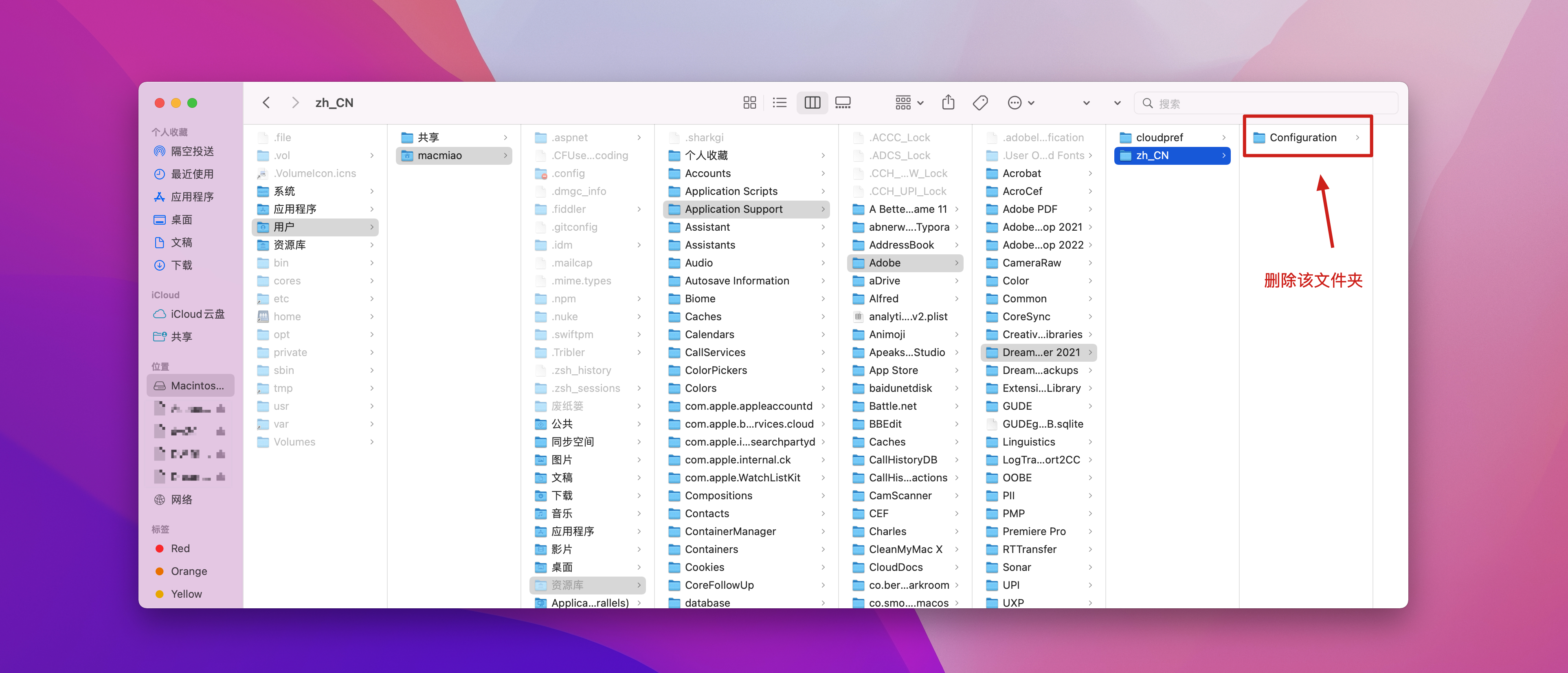 根据路径/Library/Application Support/Adobe/Dreamweaver 2021/zh_CN/找到Configuration文件夹(并删除此文件),如下图:
