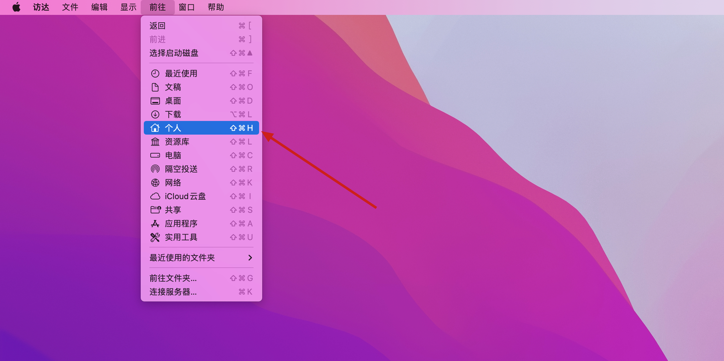 5.在访达的前往中点击个人,如下图: