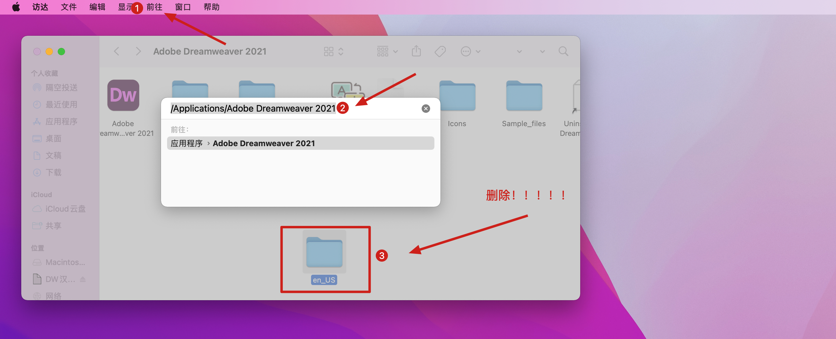 7.打开finder-点击菜单栏的-前往-前往个人文件夹,输入下方命令回车,删除en_US语言包。完美!