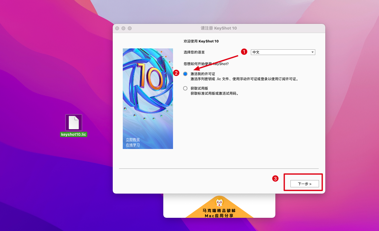 16.然后我们在应用程序中打开KeyShot 10破解版,选择我有许可证文件,然后点击下一步