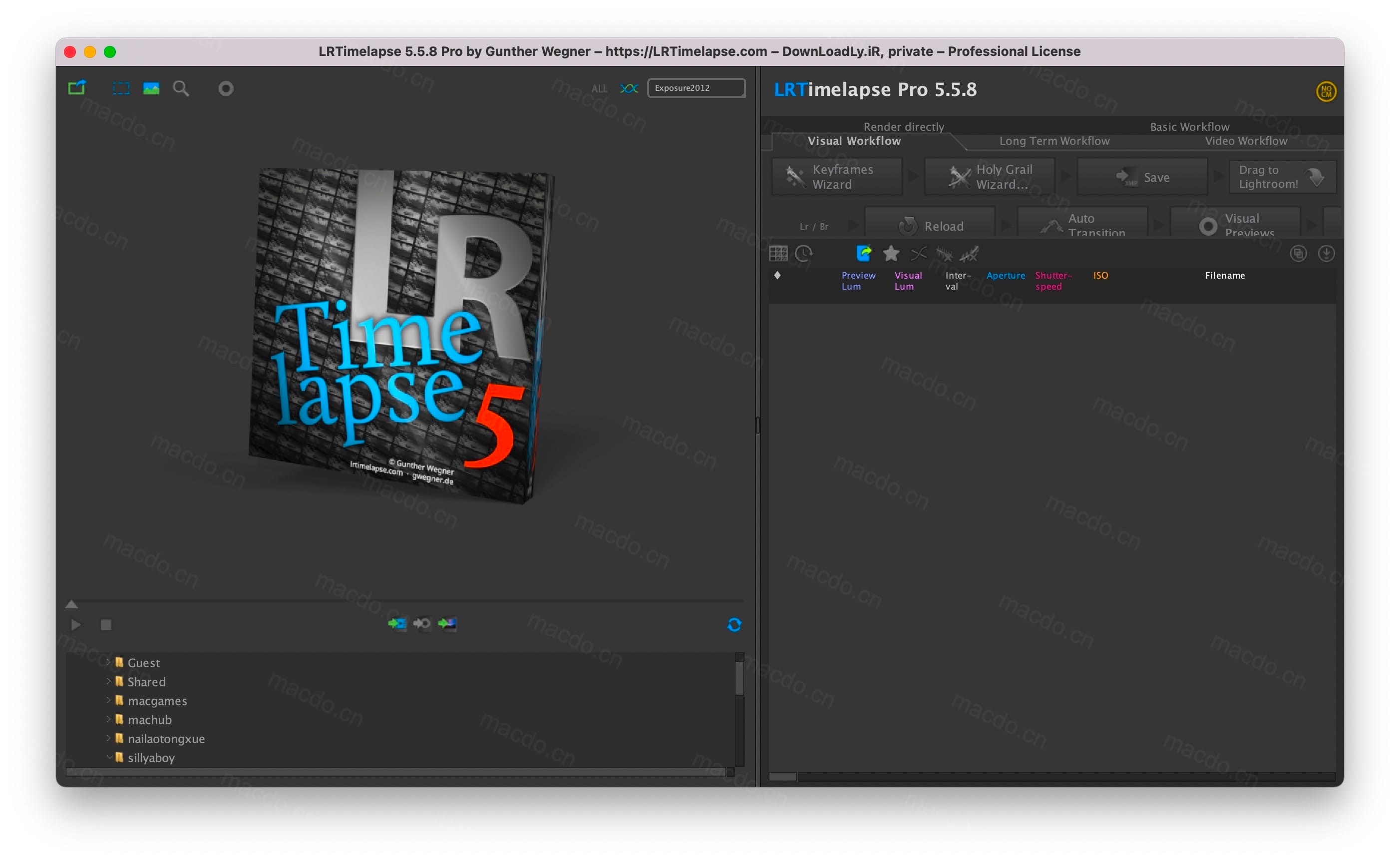 LRTimelapse 5 为延时编辑、关键帧、分级和渲染分享了最全面的解决方案。无论您使用哪种相机:LRTimelapse 都会将您的延时效果提升到一个新的水平。LRTimelapse 被大多数知名的延时摄影制作人和许多业余爱好者使用。它允许使用在 Lightroom(CC Classic、6、5 和 4)和 Adobe Camera Raw 中实现的 Adobe Camera RAW 开发引擎,在基于原始文件的工作流程中对延时序列进行关键帧和分级。