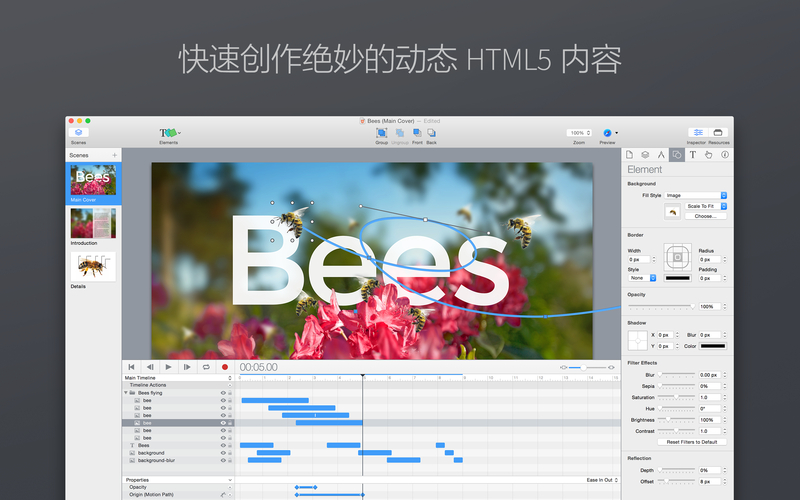 Hype Pro让你创建令人惊叹的动画和交互式网页内容。它被领先的设计师用来创建动画,为网页,信息图表,演示文稿,数字杂志,广告,iBooks,教育内容,应用原型,投资组合,动画GIF,视频,整个网站等添加“哇”因子。