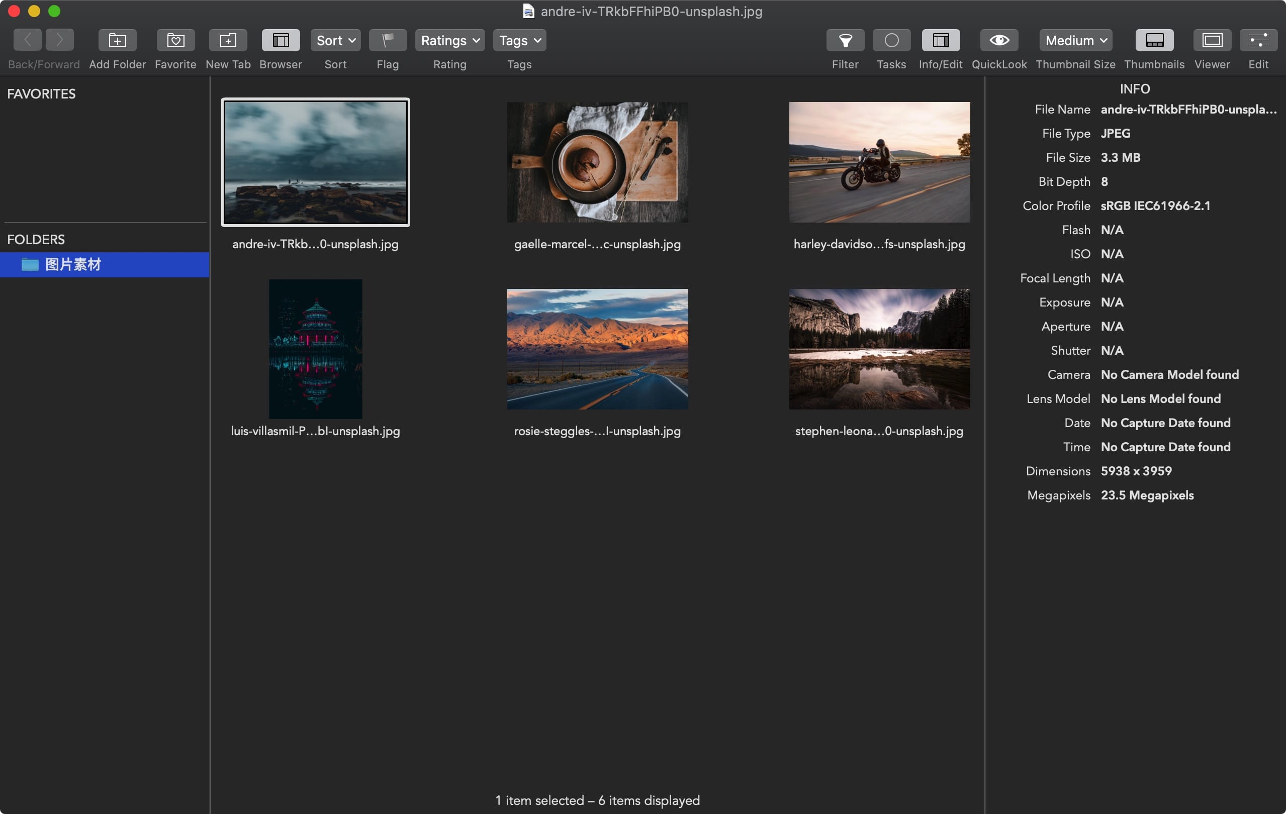 - 缩略图网格,带有用于编辑状态,文件类型,等级和标志的标记