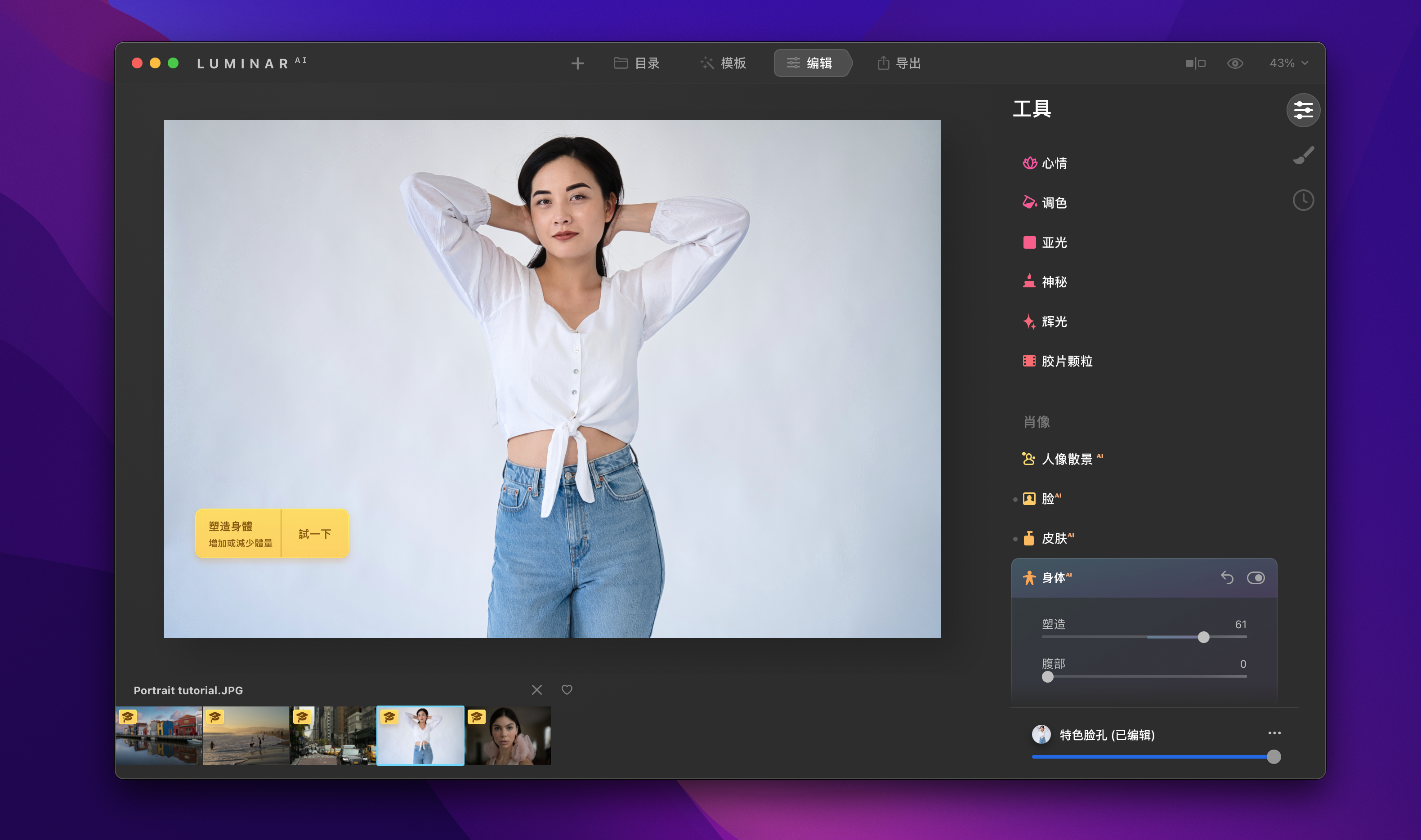 • 人体AI和脸部AI –轻轻地雕刻和完善人像