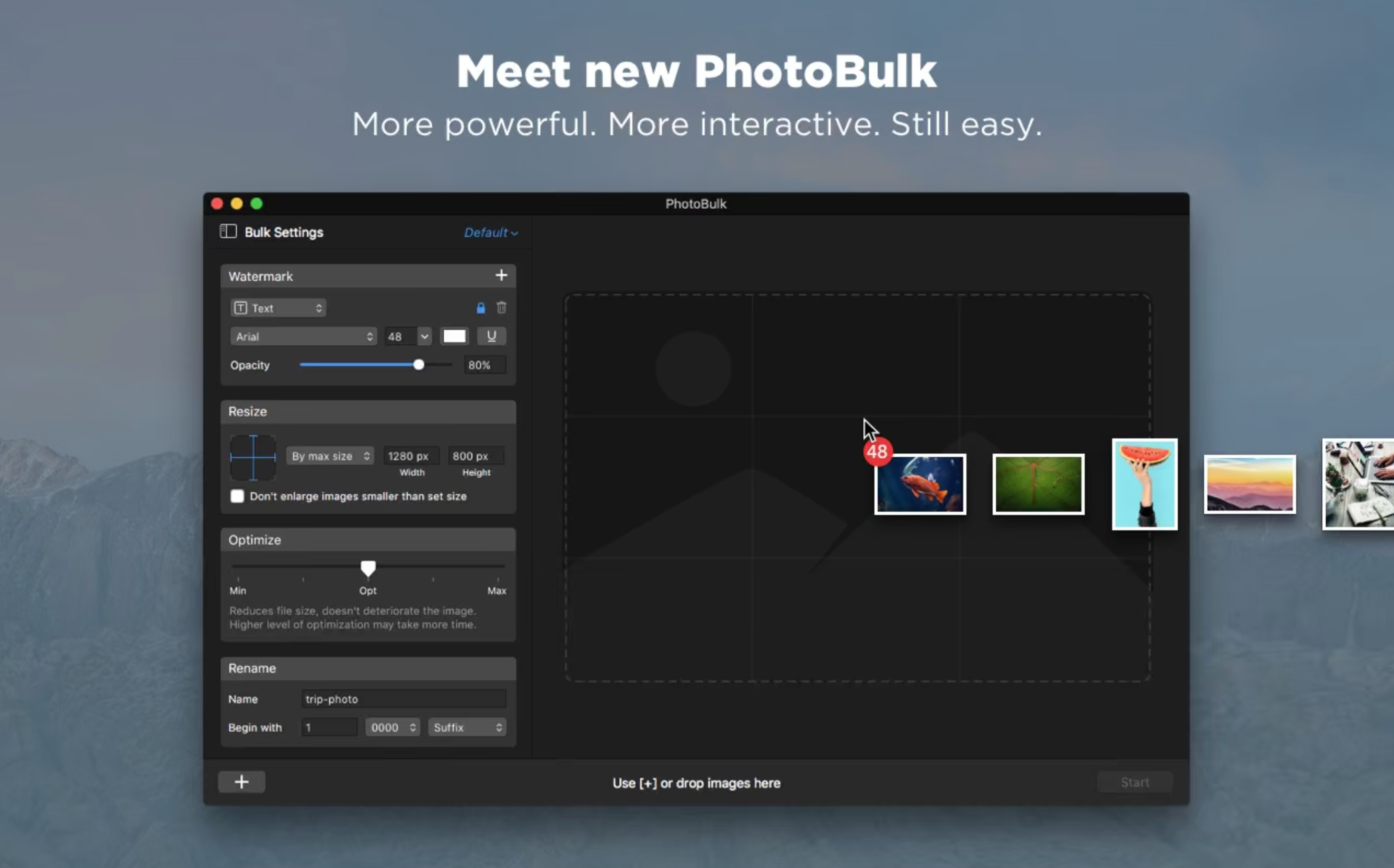 调整大小 使用Mac的图像缩放器一次处理大量各种图像 PhotoBulk是一款出色的Mac图像缩放器,非常易于使用。您可以一次,百分比,最大尺寸或根据您的自定义尺寸按比例更改许多图像的宽度和高度。