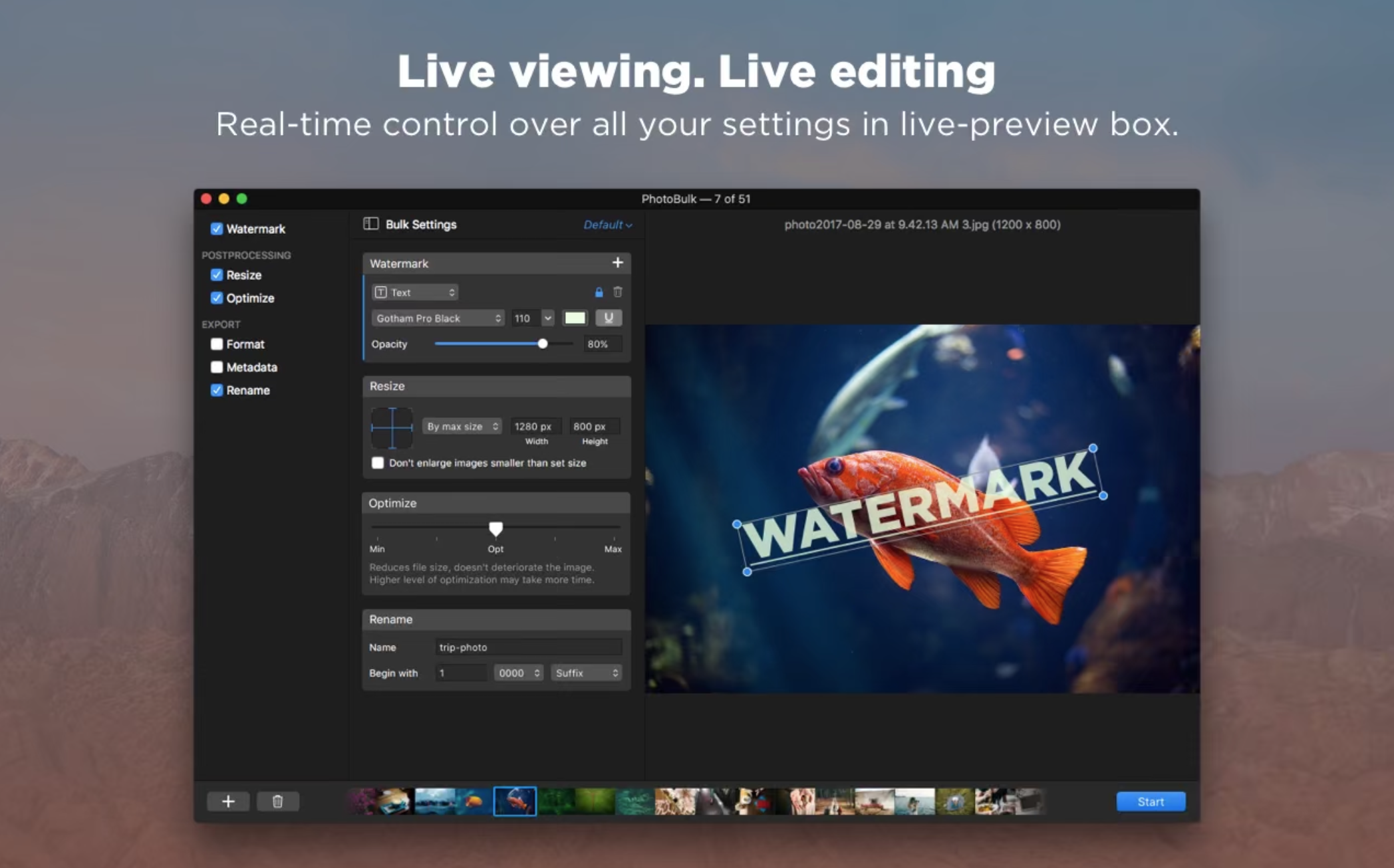 使用PhotoBulk作为设计器来创建和准备用于批处理图像编辑的预设。保存您喜欢的和最常用的设置,以便在Mac上更快地进行批量照片编辑。