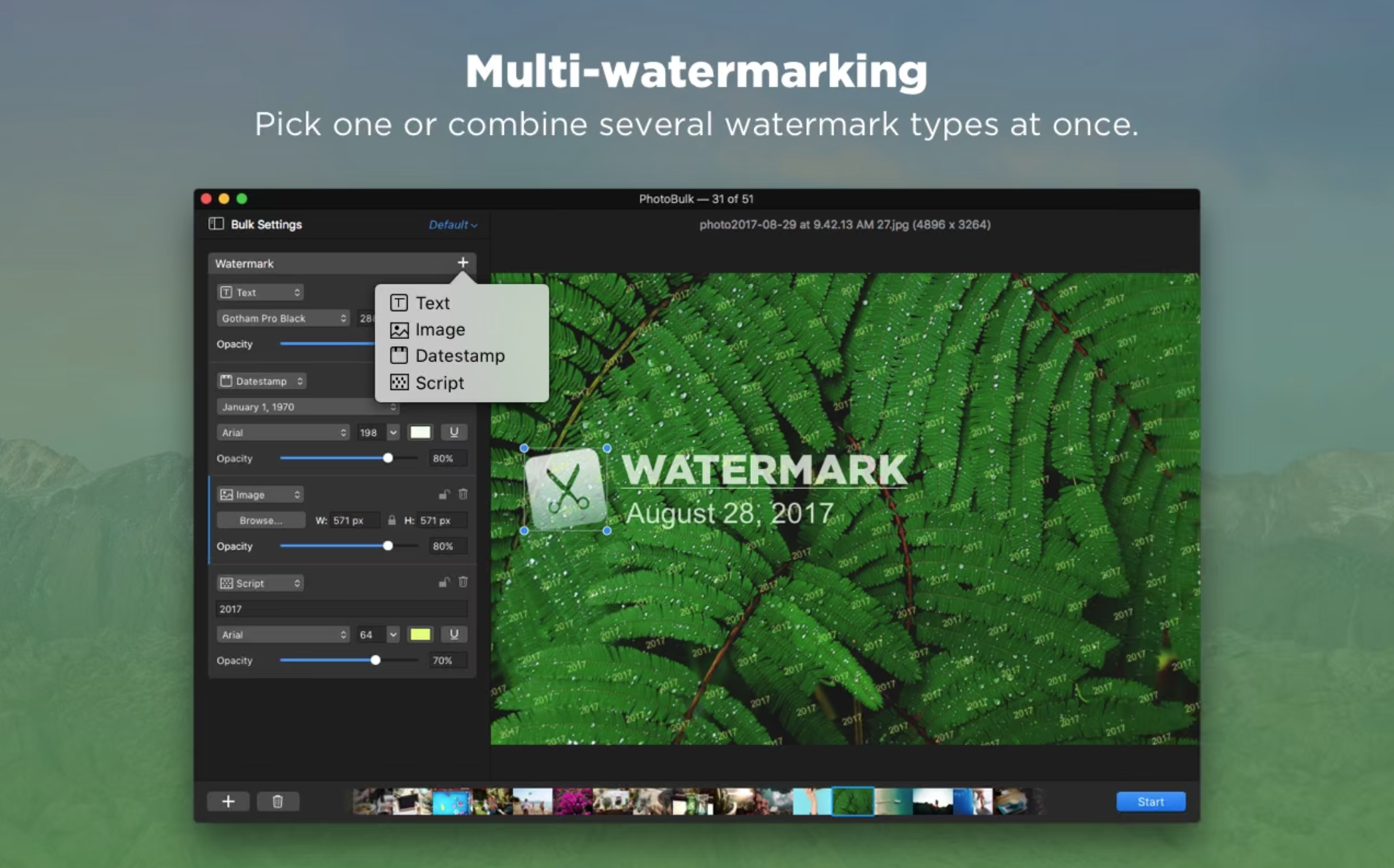 多水印 从现在开始,您可以一次为照片添加几个水印。我们的图像编辑器Mac应用程序可帮助您增强图像保护。