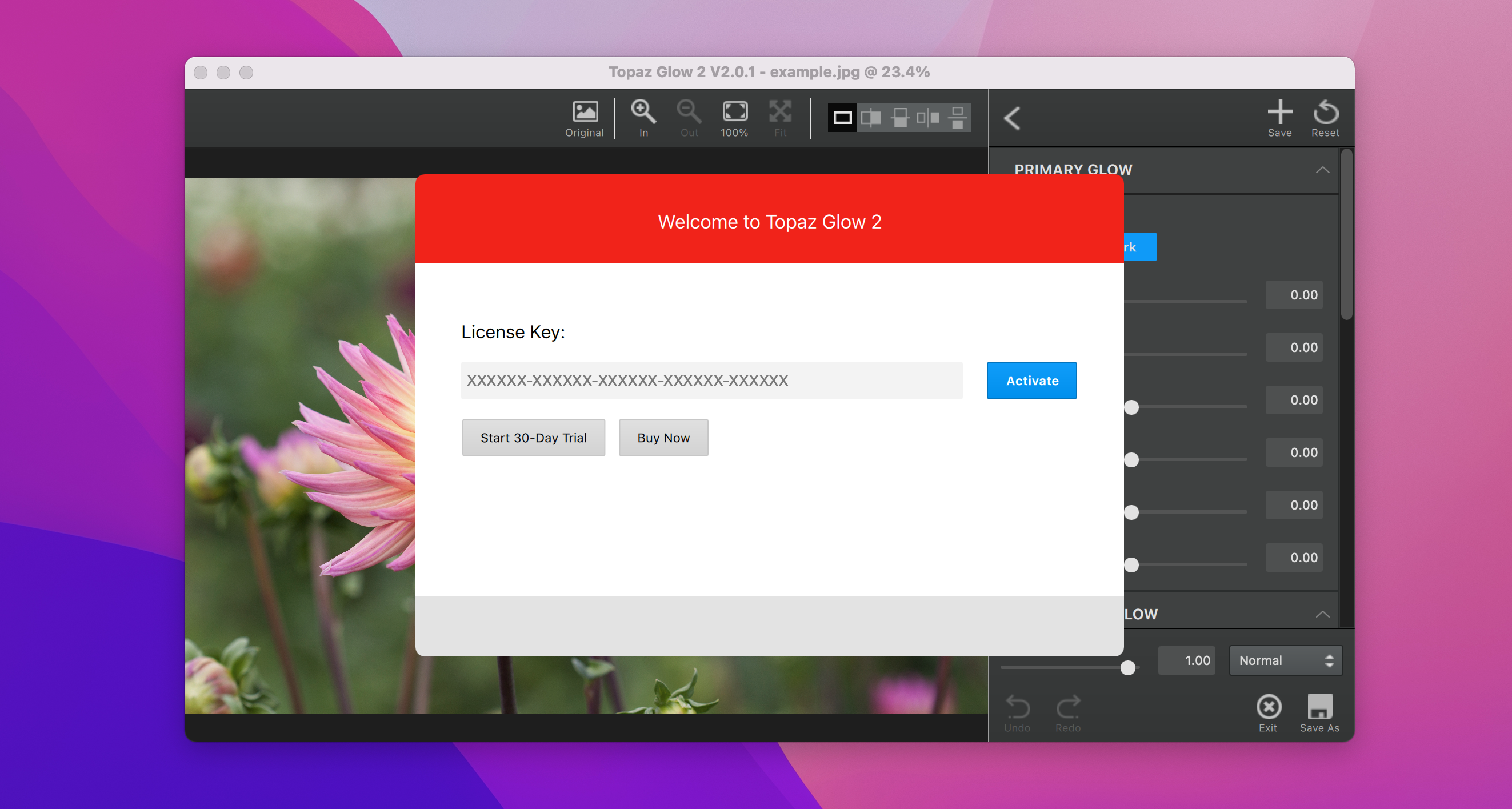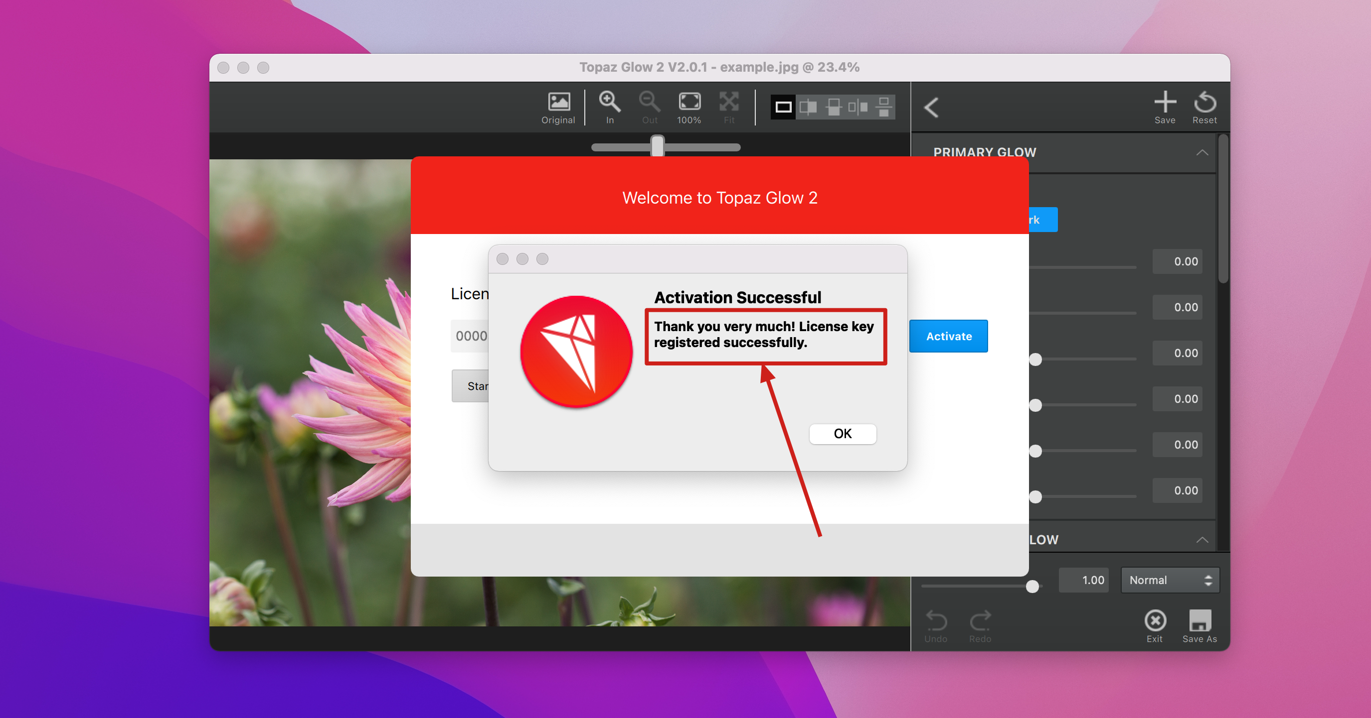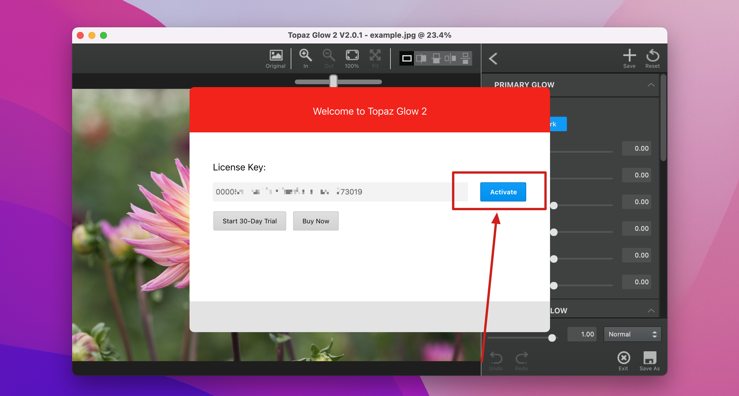 4.输入Topaz Glow注册码后点击Activate