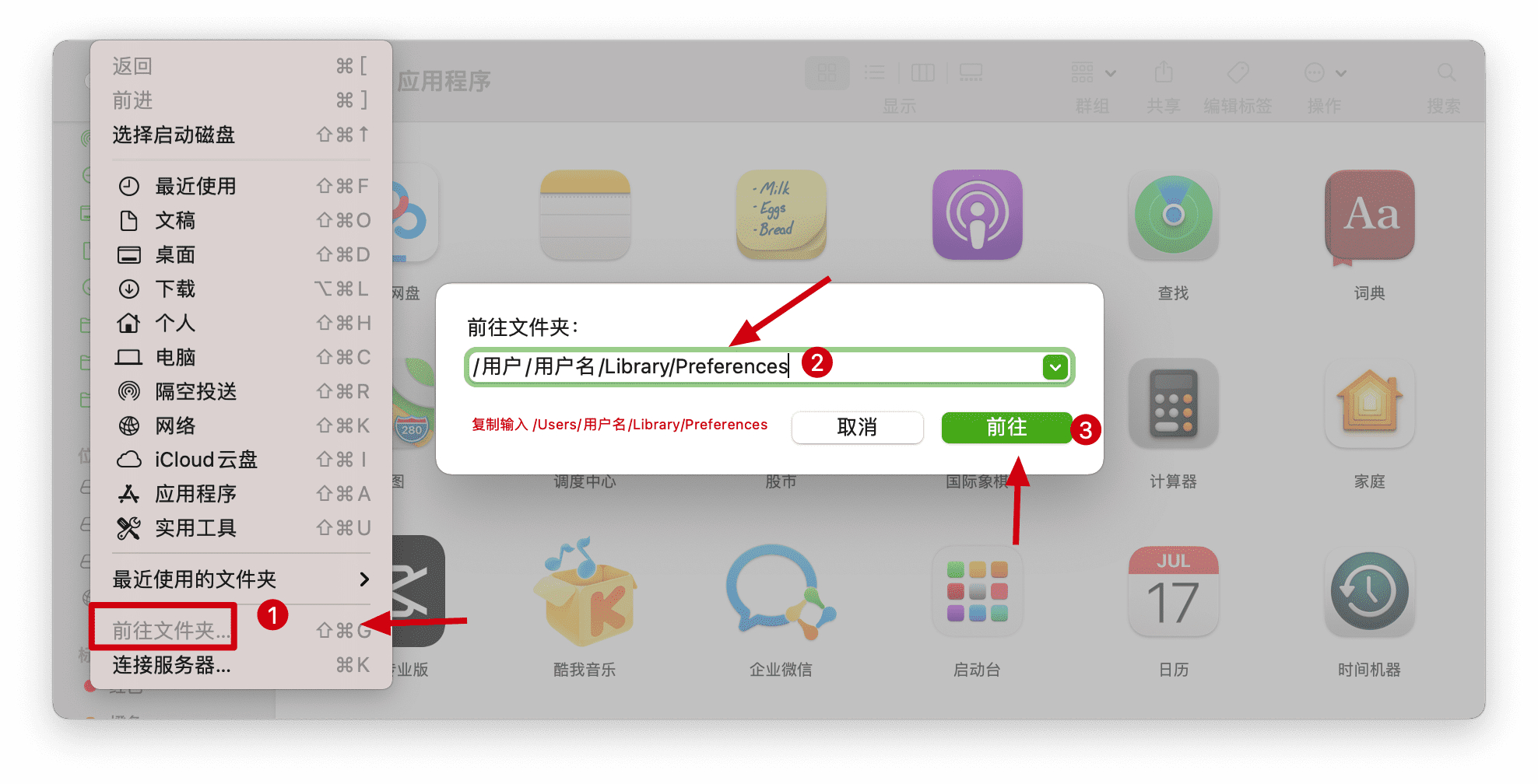 3.打开【访达】然后点击电脑菜单栏顶部的【前往】-下滑找到倒数第二个【前往文件夹】