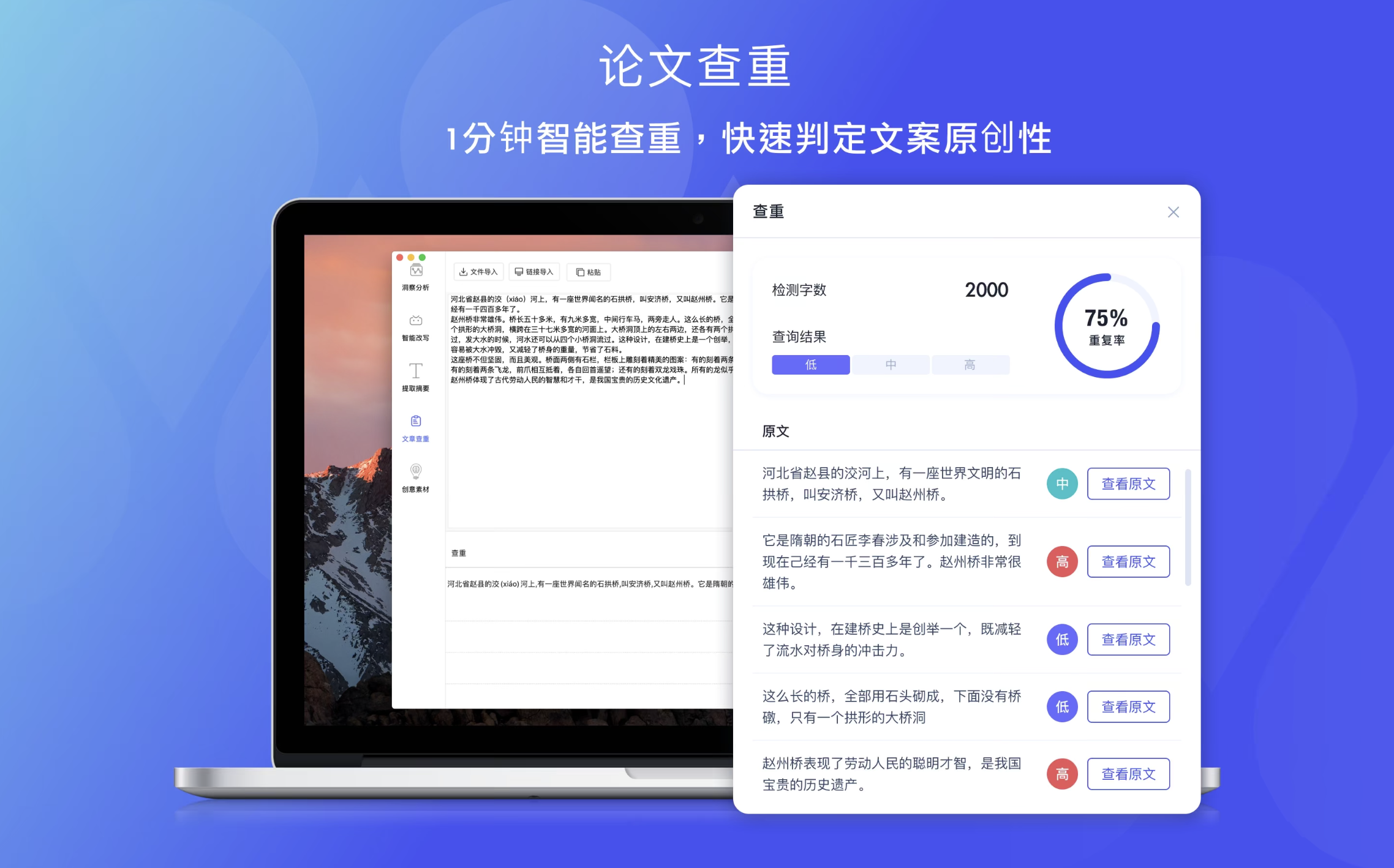 • 复制/粘贴文本,链接识别导入的文本,实时查抄抄袭