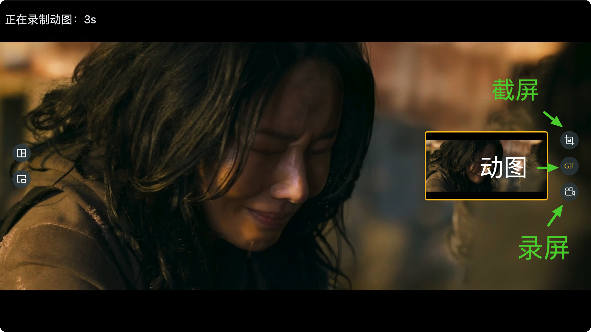 播放界面的右中侧,则是截屏、录制 GIF(最长 60 秒)、录屏按钮,非常方便。