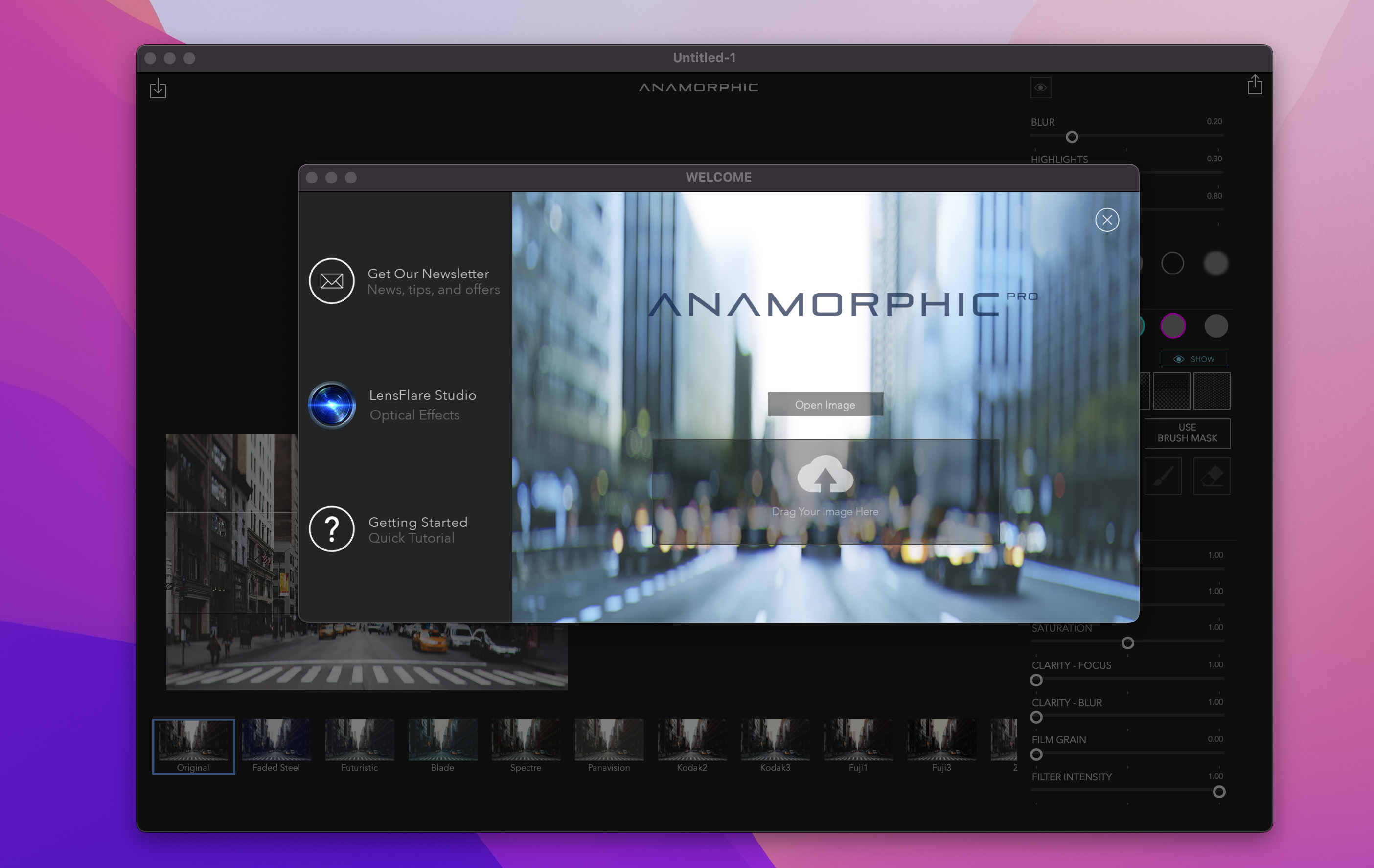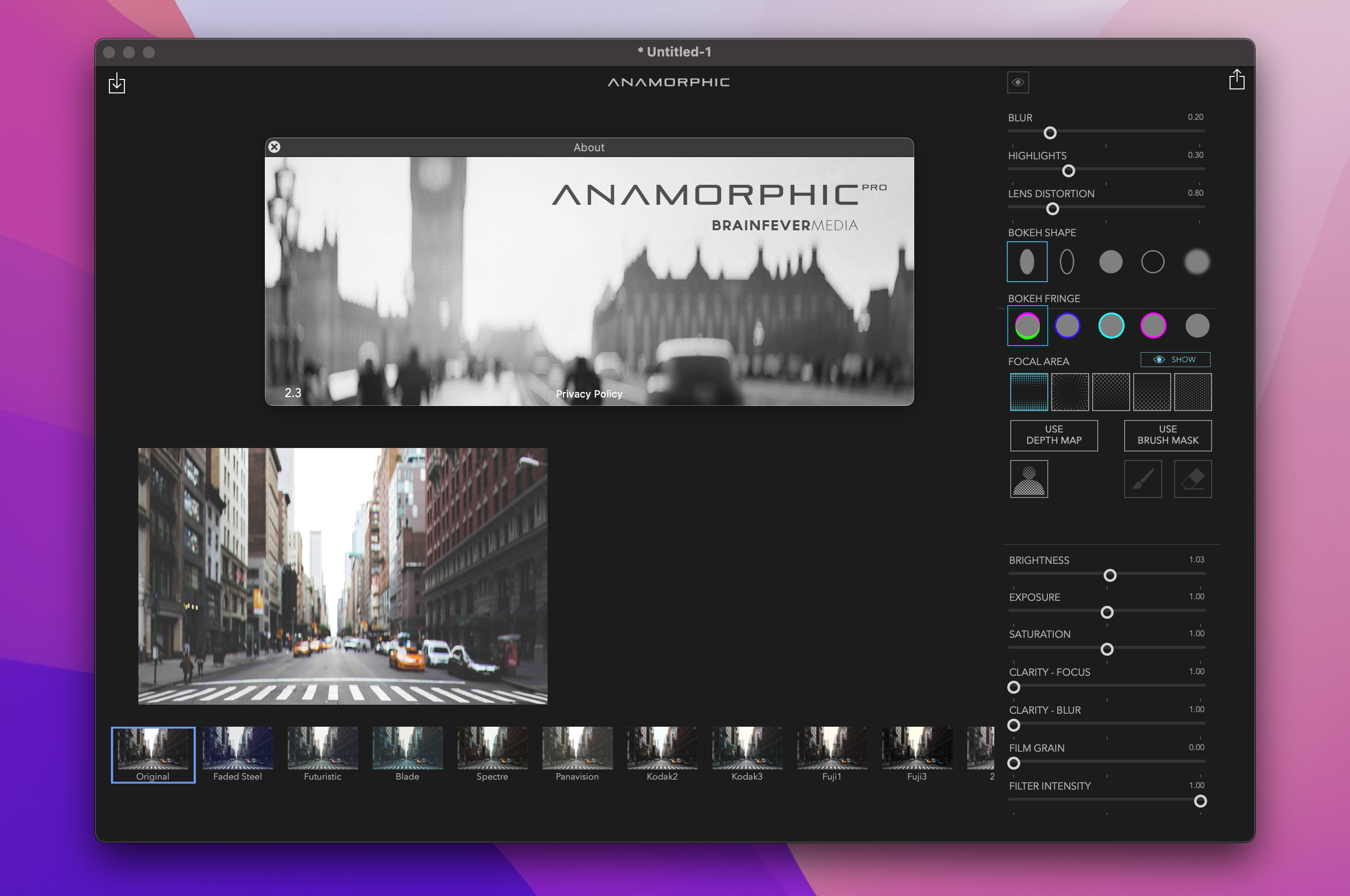 - Anamorphic Pro mac破解版还分享许多滤镜,和Instagram滤镜有点相似,另外还有一些基本的编辑功能,你可以调节照片曝光度、增加胶片颗粒效果。对于照片的虚化部分Anamorphic Pro可以调节色差,不过用户无法控制,调节是自动的,至少预发布软件是这样的。用Anamorphic Pro摄像头拍摄的两幅图像都能调整,内置摄像头App拍摄并Anamorphic编辑的图像也能调整。