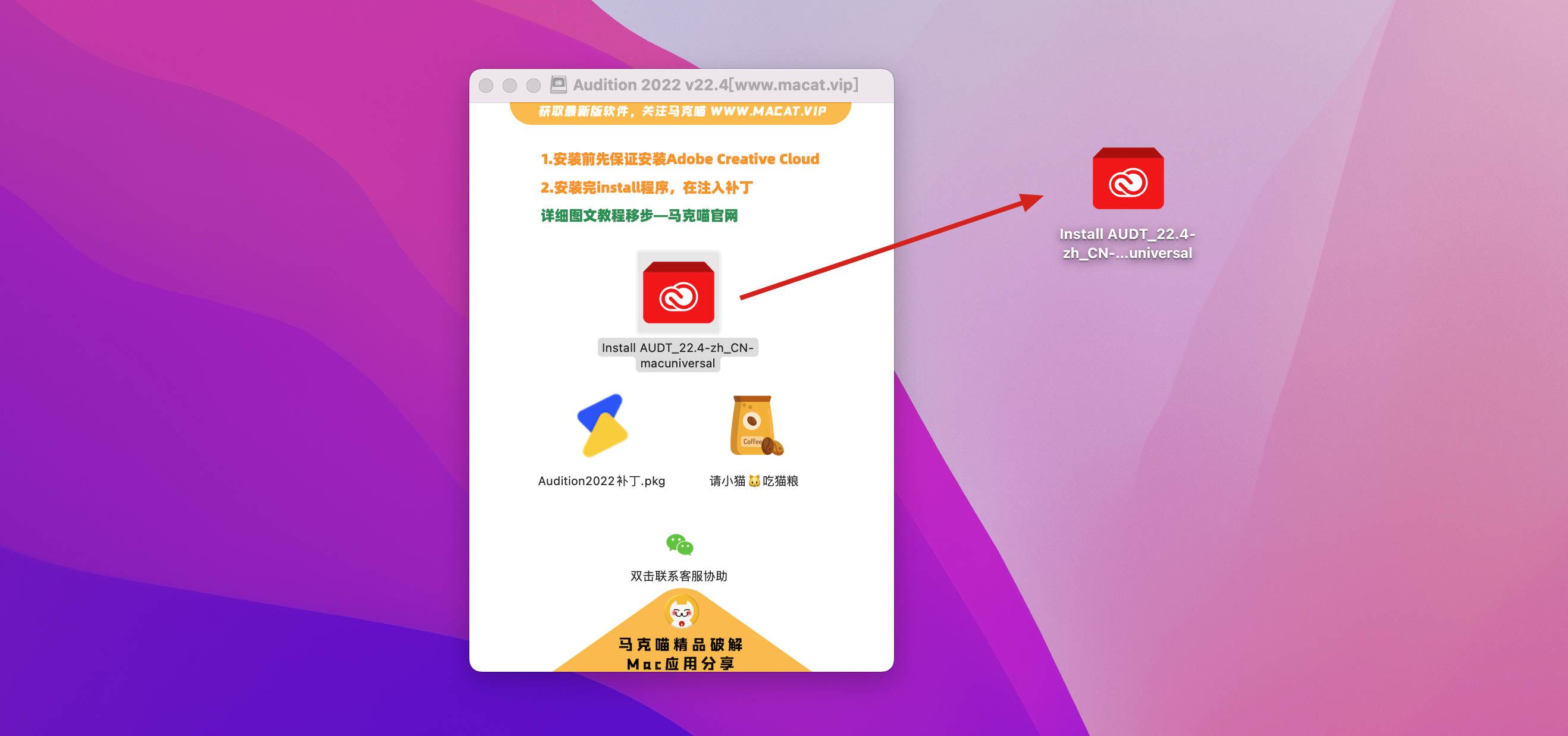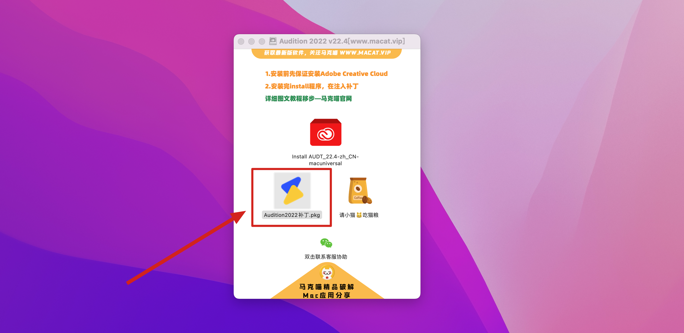安装完成后返回镜像包,双击Audition破解补丁.pkg,根据安装器提示完成安装即可破解。