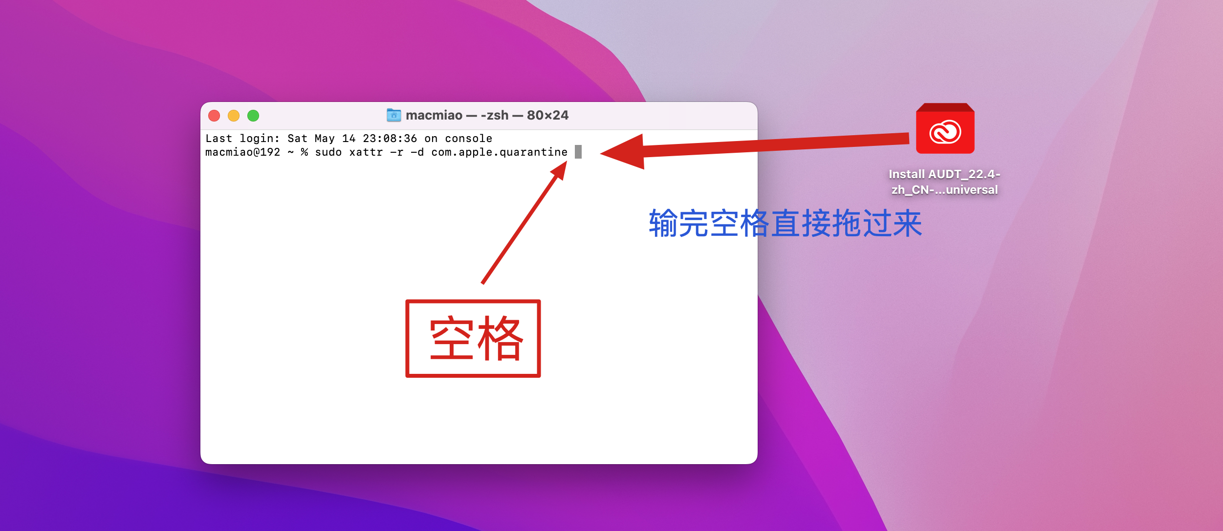 Audition 下载完成后打开,(先双击install安装,如提示”损坏”则进行下面操作)拖动Install安装器到桌面