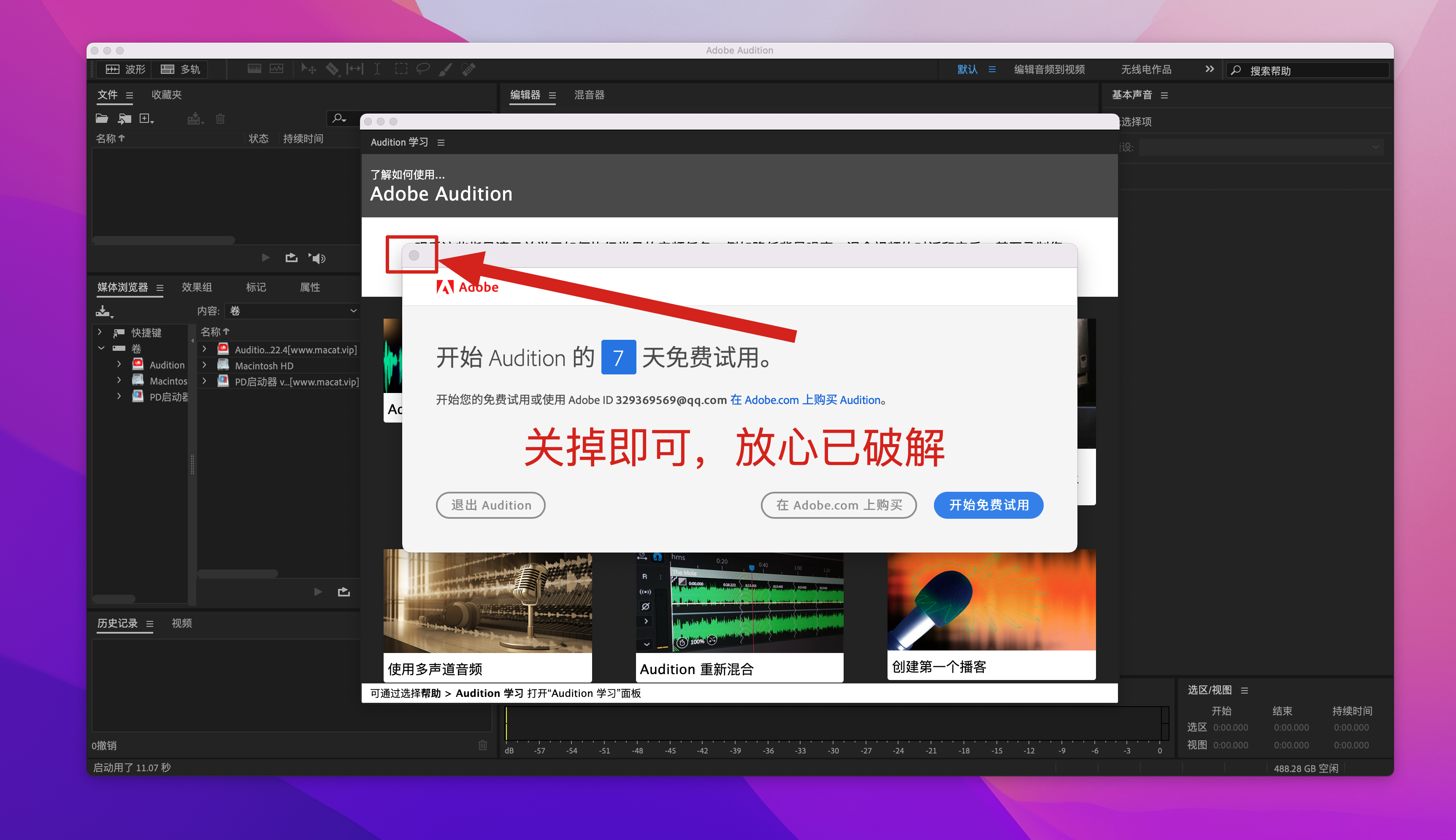运行Audition 软件,如果已经登陆ID账号,会提示7天试用(或试用已结束),点击左上角关闭即可,不影响使用(已经破解成功了的)