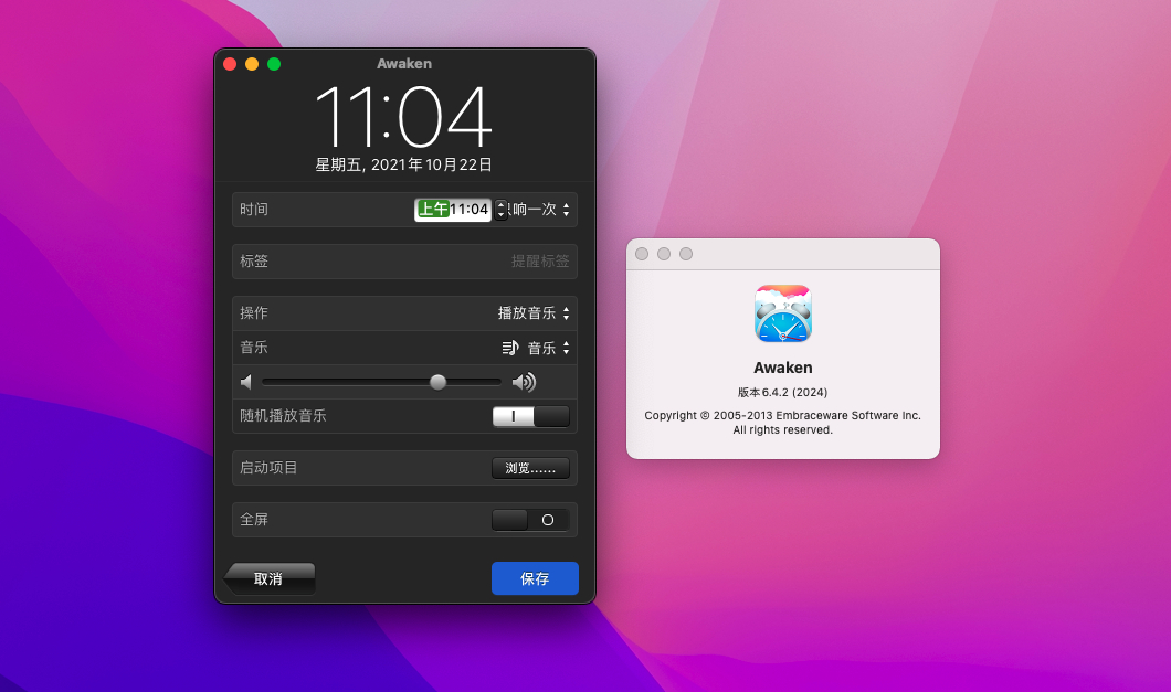 Awaken 可将您的 Mac 变成顶级音乐闹钟与睡眠计时器。可提醒 ,唤醒您的音乐或内置声音 , 通过排序与标记支持多个提醒 ,可自定义贪睡控制器 , 创建一次性提醒、每周提醒或针对一些特定日期的提醒。 音乐音量逐渐减小,屏幕亮度逐渐变暗 ? 在提醒时间启用应用程序或文件 ? 可通过 Apple 远程控制与键盘快捷键进行控制。