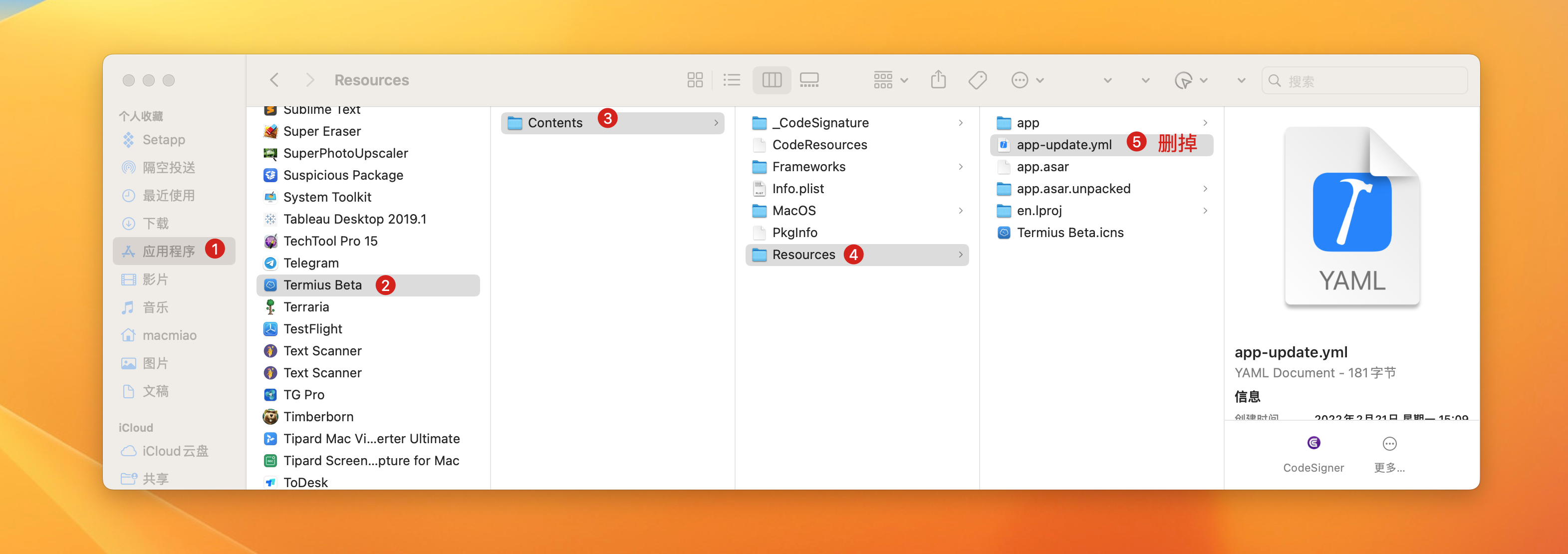 软件会自动更新,更新后会破解失效,安装后,右键打开软件—显示包内容,按以下路径删除app-update.yml文件