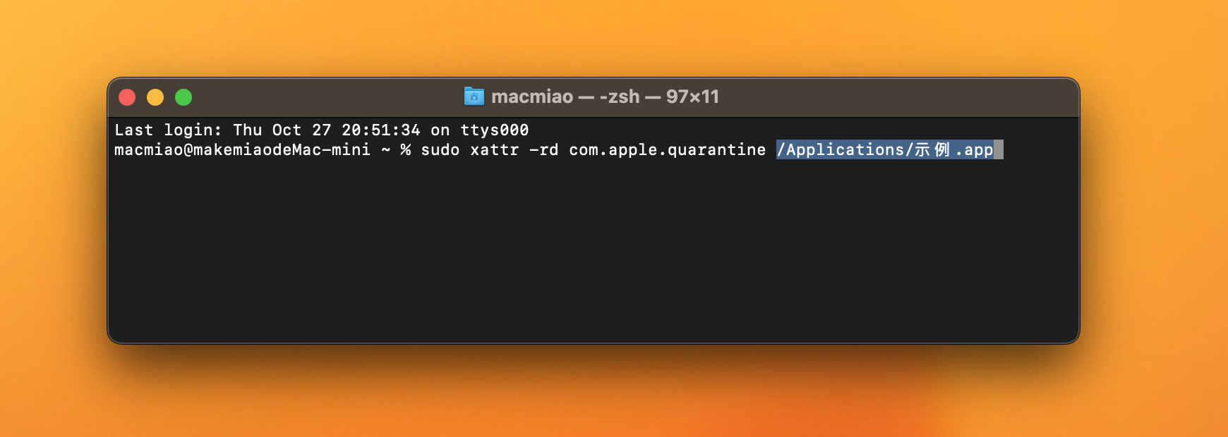 注意最后quarantine 后面加一个空格!然后打开Finder(访达),点击左侧的 应用程序,找到相关应用,拖进终端quarantine 的后面,然后按下回车键,出现钥匙图标后输入电脑的开机密码(输入过程中密码是看不到的)输入完成后再按下回车键即可。