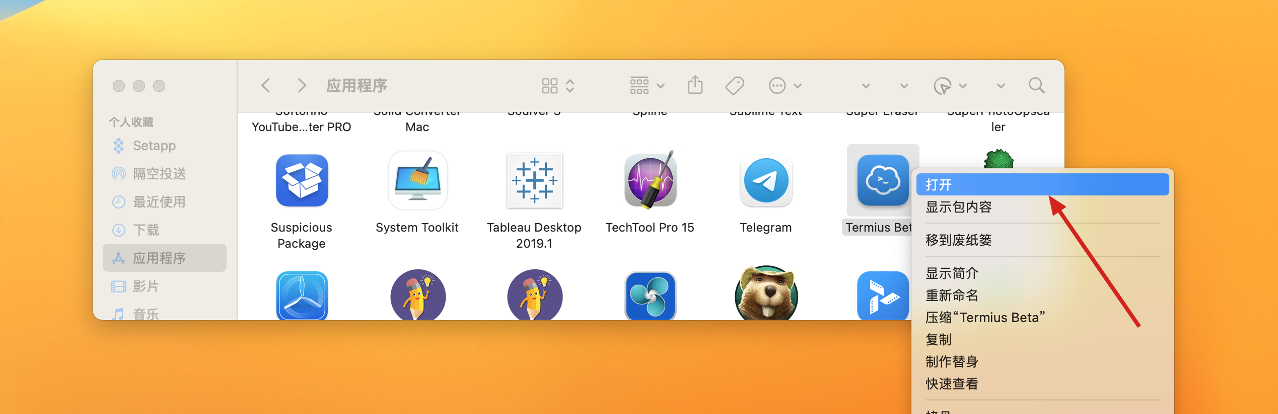 然后回到Finder-应用程序-找到Termius Beta 右键打开即可